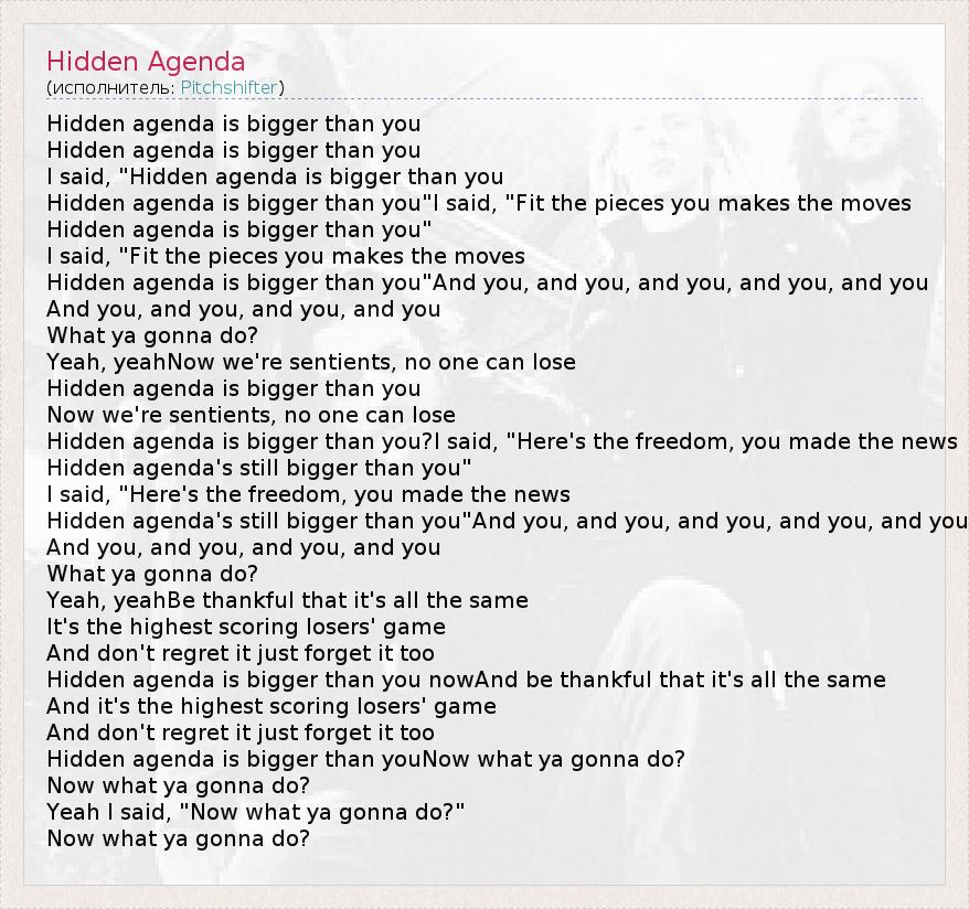 А как ты думаешь, о чем песня "Hidden Agenda" ?