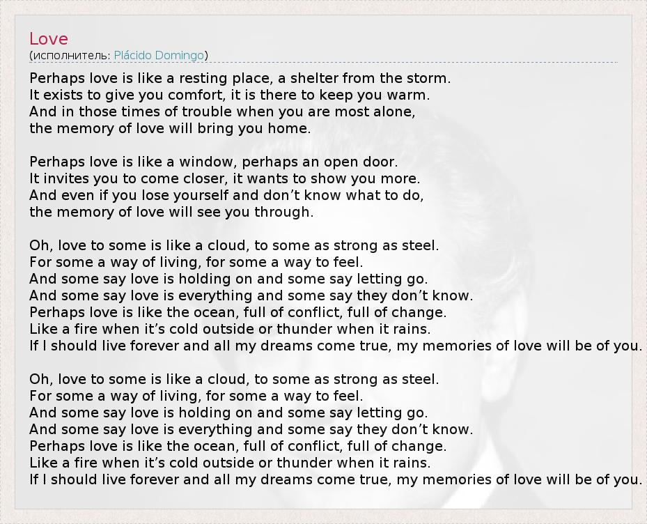Perhaps love is like a resting place, a shelter from the storm. It exists to give you comfort, it is there to keep you warm. And in those times of trouble when you are most alone, the memory of love will bring you home. Perhaps love is like a window, perhaps an open door. It invites you to come closer, it wants to show you more. And even if you lose yourself and don’t know what to do, the memory of love will see you through. Oh, love to some is like a cloud, to some as strong as steel. For some a way of living, for some a way to feel. And some say love is holding on and some say letting go. And some say love is everything and some say they don’t know. Perhaps love is like the ocean, full of conflict, full of change. Like a fire when it’s cold outside or thunder when it rains. If I should live forever and all my dreams come true, my memories of love will be of you. Oh, love to some is like a cloud, to some as strong as steel. For some a way of living, for some a way to feel. And some say love is holding on and some say letting go. And some say love is everything and some say they don’t know. Perhaps love is like the ocean, full of conflict, full of change. Like a fire when it’s cold outside or thunder when it rains. If I should live forever and all my dreams come true, my memories of love will be of you.