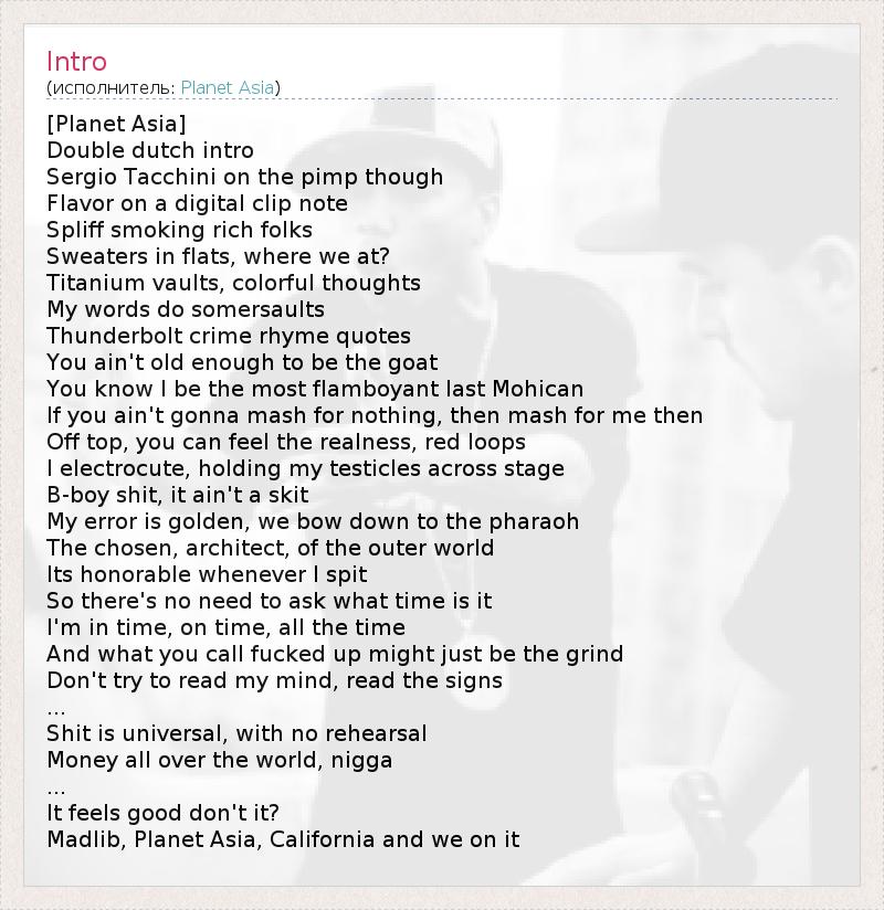 Это интересно:Planet Asia a.k.a King Medallions (настоящее имя Jason Green, род. 24 октября 1976 г.) - андерграунд хип-хоп артист из Fresno, California, является участником хип-хоп группы Cali Agents и Skhool Yard. Он также хорошо известен своей обширной дискографией микстейпов.В 1990-х годах, Planet Asia переехал из Fresno, California в San Francisco, California и начал серьезно заниматься рэпом.... продолжение