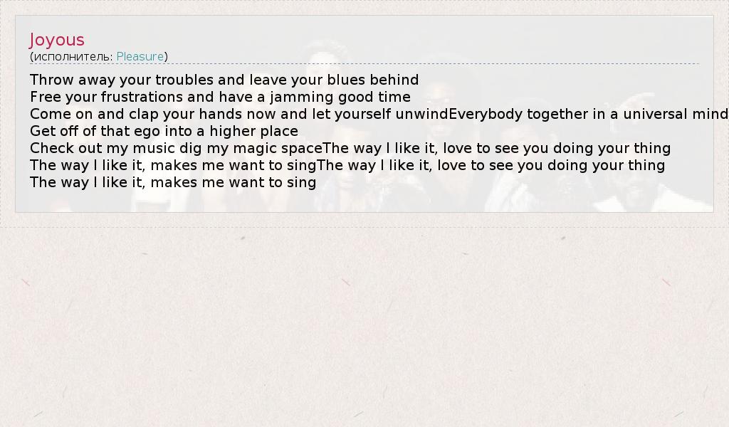 Это интересно:Pleasure - американская фанк/соул/диско группа. Состав: Marlon McClain (электро- и акустическая гитара, бэк-вокал), Sherman Davis (вокал), Bruce Carter (ударные), Donald Hepburn (клавишные, бэк-вокал), Nathaniel Phillips (бас, бэк-вокал), Bruce Smith (перкуссия, бэк-вокал), Dennis Springer (саксофон), Dan Brewster (тромбон, бэк-вокал).Образована в г. Портленд, штат Орегон, в 1972 г. В 1974 г. группа заключила контракт со звукозаписывающей компанией Fantasy Records.... продолжение