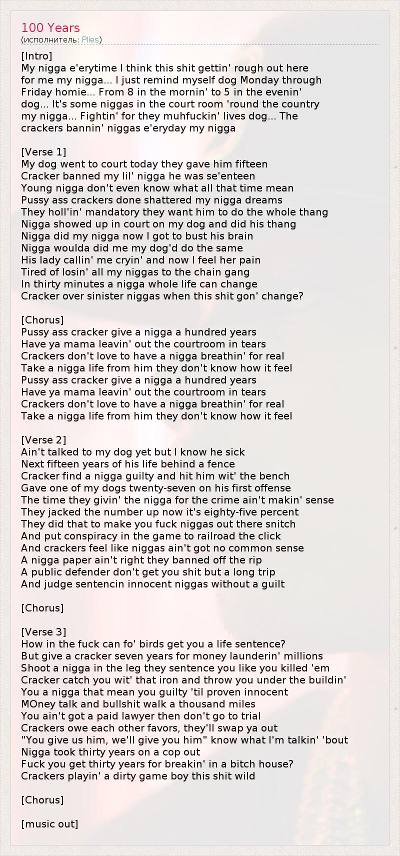 Это интересно:Plies - уроженец Флориды, родился 1 июля 1976 года. Начал свою рэп-карьеру еще в 2004 году, однако баловал слушателей лишь гостевыми участиями в треках известных артистов.Plies и его брат Levatte начали свою карьеру в 1999 году, сотрудничая с "Big Gates Records". Первой композицией стала "Tell Dem Krackers Dat", после чего ребята стали официально сотрудничать с "Slip-N-Slide Records". Позднее лейбл предложил выпустить... продолжение