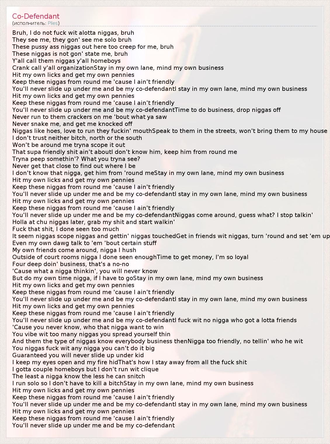 You'll never slide up under me and be my co-defendantI fuck wit no nigga who got a lotta friends