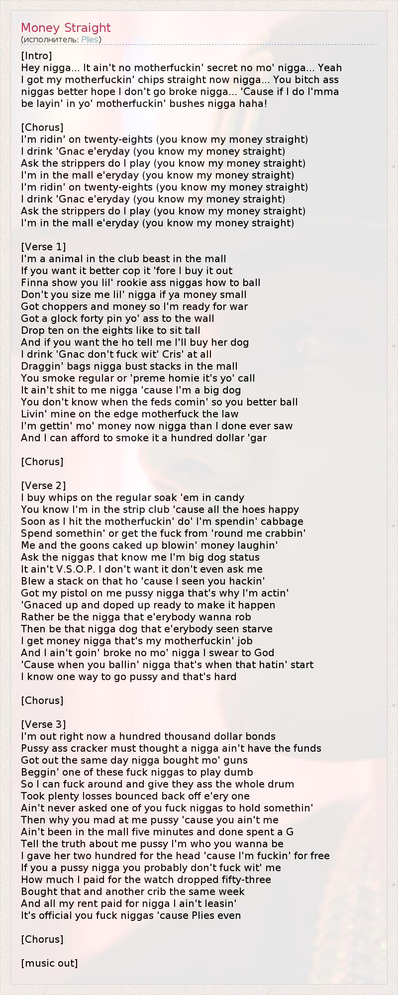 [Intro] Hey nigga... It ain't no motherfuckin' secret no mo' nigga... Yeah I got my motherfuckin' chips straight now nigga... You bitch ass niggas better hope I don't go broke nigga... 'Cause if I do I'mma be layin' in yo' motherfuckin' bushes nigga haha! [Chorus] I'm ridin' on twenty-eights (you know my money straight) I drink 'Gnac e'eryday (you know my money straight) Ask the strippers do I play (you know my money straight) I'm in the mall e'eryday (you know my money straight) I'm ridin' on twenty-eights (you know my money straight) I drink 'Gnac e'eryday (you know my money straight) Ask the strippers do I play (you know my money straight) I'm in the mall e'eryday (you know my money straight) [Verse 1] I'm a animal in the club beast in the mall If you want it better cop it 'fore I buy it out Finna show you lil' rookie ass niggas how to ball Don't you size me lil' nigga if ya money small Got choppers and money so I'm ready for war Got a glock forty pin yo' ass to the wall Drop ten on the eights like to sit tall And if you want the ho tell me I'll buy her dog I drink 'Gnac don't fuck wit' Cris' at all Draggin' bags nigga bust stacks in the mall You smoke regular or 'preme homie it's yo' call It ain't shit to me nigga 'cause I'm a big dog You don't know when the feds comin' so you better ball Livin' mine on the edge motherfuck the law I'm gettin' mo' money now nigga than I done ever saw And I can afford to smoke it a hundred dollar 'gar [Chorus] [Verse 2] I buy whips on the regular soak 'em in candy You know I'm in the strip club 'cause all the hoes happy Soon as I hit the motherfuckin' do' I'm spendin' cabbage Spend somethin' or get the fuck from 'round me crabbin' Me and the goons caked up blowin' money laughin' Ask the niggas that know me I'm big dog status It ain't V.S.O.P. I don't want it don't even ask me Blew a stack on that ho 'cause I seen you hackin' Got my pistol on me pussy nigga that's why I'm actin' 'Gnaced up and doped up ready to make it happen Rather be the nigga that e'erybody wanna rob Then be that nigga dog that e'erybody seen starve I get money nigga that's my motherfuckin' job And I ain't goin' broke no mo' nigga I swear to God 'Cause when you ballin' nigga that's when that hatin' start I know one way to go pussy and that's hard [Chorus] [Verse 3] I'm out right now a hundred thousand dollar bonds Pussy ass cracker must thought a nigga ain't have the funds Got out the same day nigga bought mo' guns Beggin' one of these fuck niggas to play dumb So I can fuck around and give they ass the whole drum Took plenty losses bounced back off e'ery one Ain't never asked one of you fuck niggas to hold somethin' Then why you mad at me pussy 'cause you ain't me Ain't been in the mall five minutes and done spent a G Tell the truth about me pussy I'm who you wanna be I gave her two hundred for the head 'cause I'm fuckin' for free If you a pussy nigga you probably don't fuck wit' me How much I paid for the watch dropped fifty-three Bought that and another crib the same week And all my rent paid for nigga I ain't leasin' It's official you fuck niggas 'cause Plies even [Chorus] [music out]