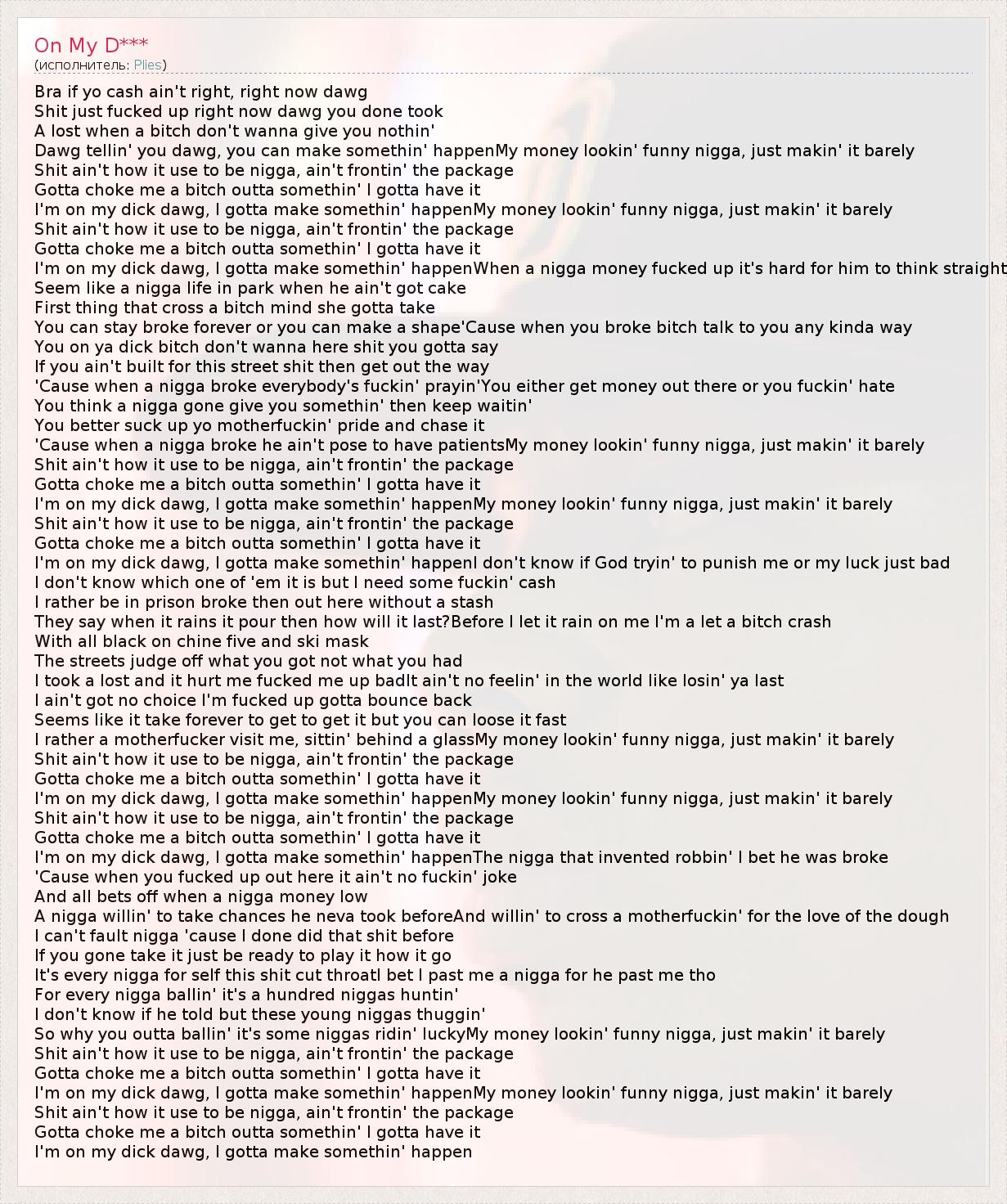 Это интересно:Plies - уроженец Флориды, родился 1 июля 1976 года. Начал свою рэп-карьеру еще в 2004 году, однако баловал слушателей лишь гостевыми участиями в треках известных артистов.Plies и его брат Levatte начали свою карьеру в 1999 году, сотрудничая с "Big Gates Records". Первой композицией стала "Tell Dem Krackers Dat", после чего ребята стали официально сотрудничать с "Slip-N-Slide Records". Позднее лейбл предложил выпустить... продолжение