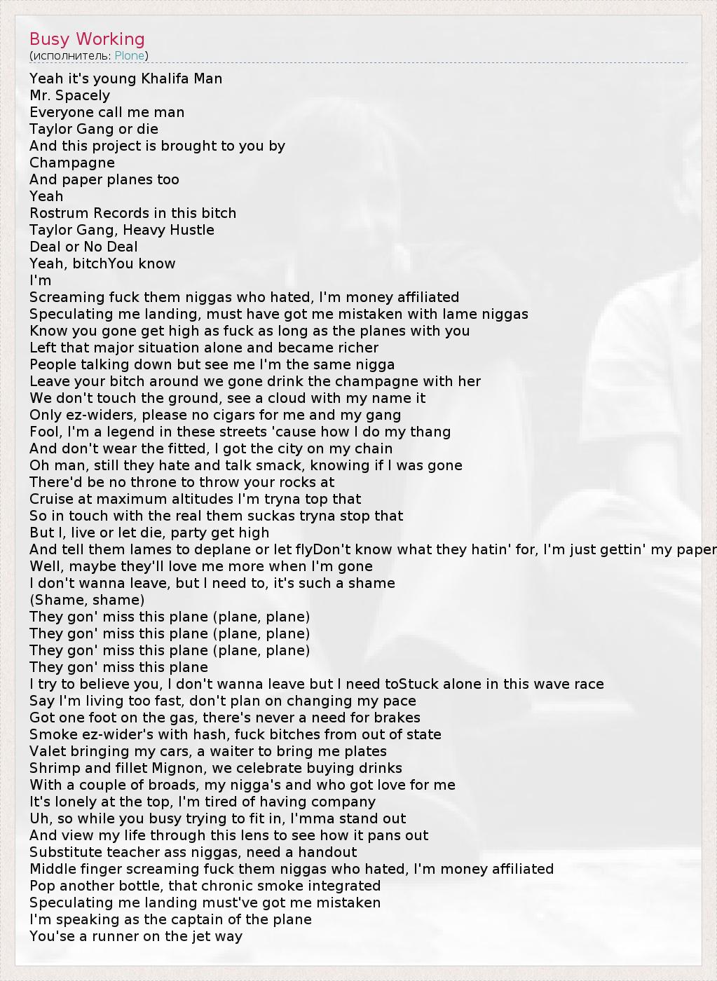 Yeah it's young Khalifa Man Mr. Spacely Everyone call me man Taylor Gang or die And this project is brought to you by Champagne And paper planes too Yeah Rostrum Records in this bitch Taylor Gang, Heavy Hustle Deal or No Deal Yeah, bitchYou know I'm Screaming fuck them niggas who hated, I'm money affiliated Speculating me landing, must have got me mistaken with lame niggas Know you gone get high as fuck as long as the planes with you Left that major situation alone and became richer People talking down but see me I'm the same nigga Leave your bitch around we gone drink the champagne with her We don't touch the ground, see a cloud with my name it Only ez-widers, please no cigars for me and my gang Fool, I'm a legend in these streets 'cause how I do my thang And don't wear the fitted, I got the city on my chain Oh man, still they hate and talk smack, knowing if I was gone There'd be no throne to throw your rocks at Cruise at maximum altitudes I'm tryna top that So in touch with the real them suckas tryna stop that But I, live or let die, party get high And tell them lames to deplane or let flyDon't know what they hatin' for, I'm just gettin' my paper Well, maybe they'll love me more when I'm gone I don't wanna leave, but I need to, it's such a shame (Shame, shame) They gon' miss this plane (plane, plane) They gon' miss this plane (plane, plane) They gon' miss this plane (plane, plane) They gon' miss this plane I try to believe you, I don't wanna leave but I need toStuck alone in this wave race Say I'm living too fast, don't plan on changing my pace Got one foot on the gas, there's never a need for brakes Smoke ez-wider's with hash, fuck bitches from out of state Valet bringing my cars, a waiter to bring me plates Shrimp and fillet Mignon, we celebrate buying drinks With a couple of broads, my nigga's and who got love for me It's lonely at the top, I'm tired of having company Uh, so while you busy trying to fit in, I'mma stand out And view my life through this lens to see how it pans out Substitute teacher ass niggas, need a handout Middle finger screaming fuck them niggas who hated, I'm money affiliated Pop another bottle, that chronic smoke integrated Speculating me landing must've got me mistaken I'm speaking as the captain of the plane You'se a runner on the jet way
