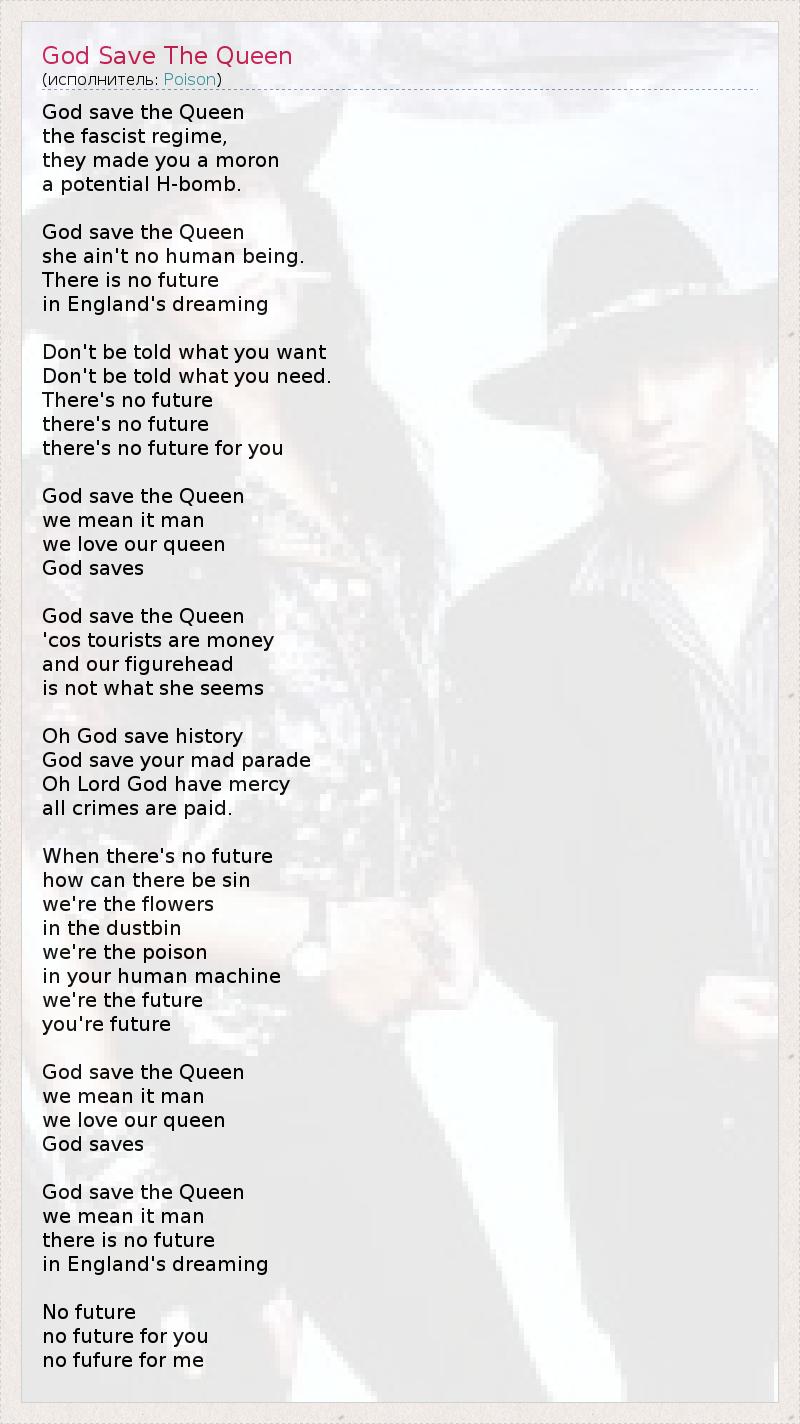 God save the Queen the fascist regime, they made you a moron a potential H-bomb. God save the Queen she ain't no human being. There is no future in England's dreaming Don't be told what you want Don't be told what you need. There's no future there's no future there's no future for you God save the Queen we mean it man we love our queen God saves God save the Queen 'cos tourists are money and our figurehead is not what she seems Oh God save history God save your mad parade Oh Lord God have mercy all crimes are paid. When there's no future how can there be sin we're the flowers in the dustbin we're the poison in your human machine we're the future you're future God save the Queen we mean it man we love our queen God saves God save the Queen we mean it man there is no future in England's dreaming No future no future for you no fufure for me