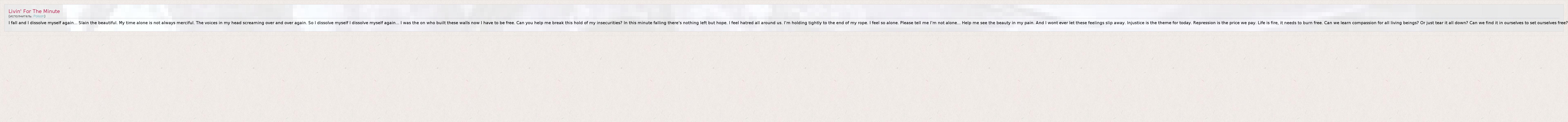 I fall and I dissolve myself again... Slain the beautiful. My time alone is not always merciful. The voices in my head screaming over and over again. So I dissolve myself I dissolve myself again... I was the on who built these walls now I have to be free. Can you help me break this hold of my insecurities? In this minute falling there's nothing left but hope. I feel hatred all around us. I'm holding tightly to the end of my rope. I feel so alone. Please tell me I'm not alone... Help me see the beauty in my pain. And I wont ever let these feelings slip away. Injustice is the theme for today. Repression is the price we pay. Life is fire, it needs to burn free. Can we learn compassion for all living beings? Or just tear it all down? Can we find it in ourselves to set ourselves free?