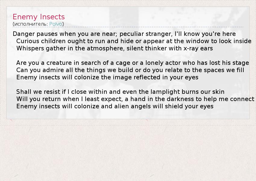 А как ты думаешь, о чем песня "Enemy Insects" ?