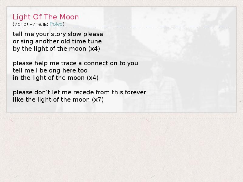 tell me your story slow please or sing another old time tune by the light of the moon (x4) please help me trace a connection to you tell me I belong here too in the light of the moon (x4) please don't let me recede from this forever like the light of the moon (x7)