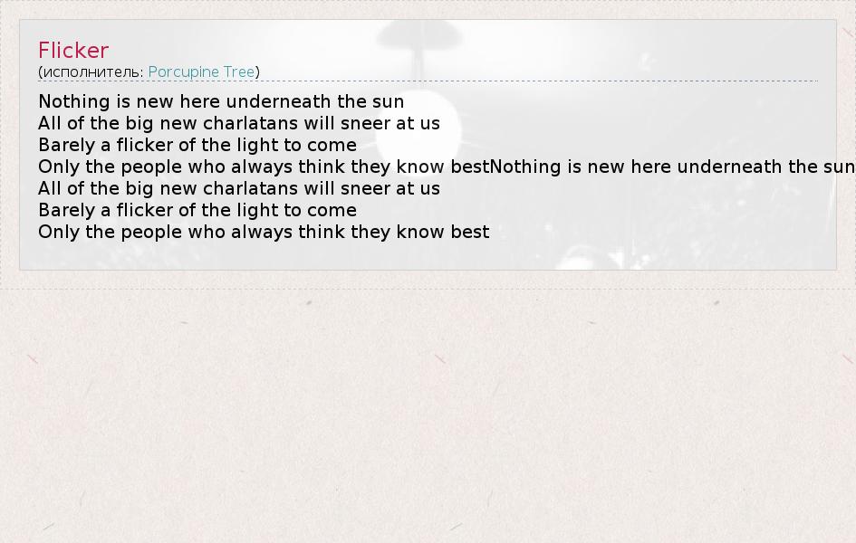 Это интересно:Porcupine Tree — английская группа, играющая прогрессивный рок, основана в графстве Хартфордшир, Англия. Это самый успешный музыкальный проект Стивена Уилсона, что наглядно доказывается растущей популярностью группы. Уникальное звучание этой группы — результат смешения прогрессивного рока, психоделики, эмбиента и, в более поздних альбомах, металла.Группа появилась в 1987 году... продолжение