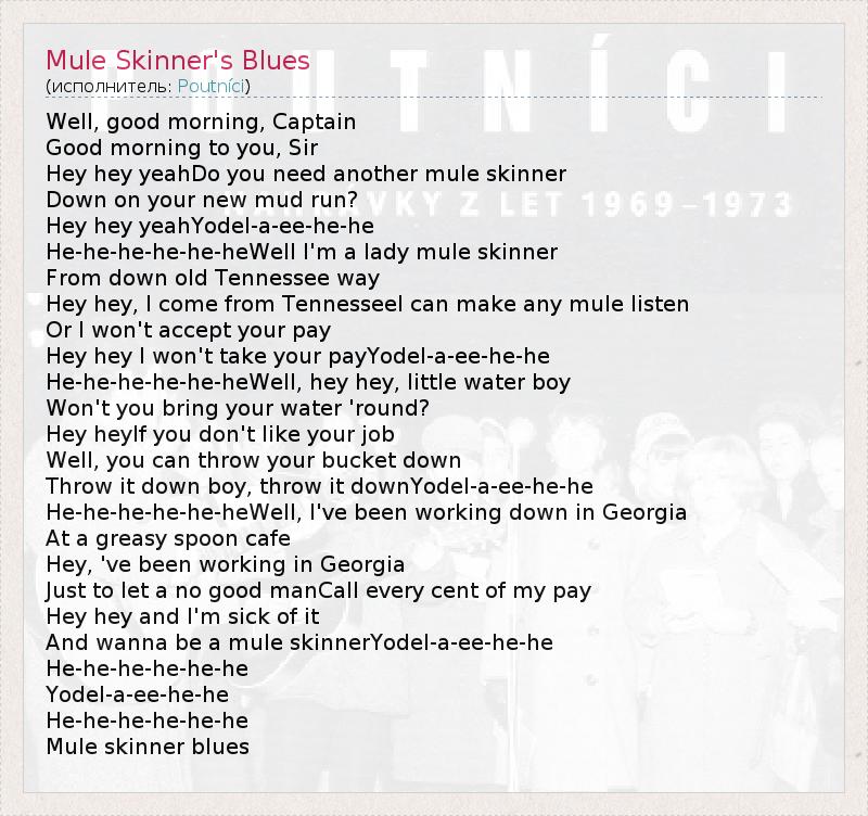 Well, good morning, Captain Good morning to you, Sir Hey hey yeahDo you need another mule skinner Down on your new mud run? Hey hey yeahYodel-a-ee-he-he He-he-he-he-he-heWell I'm a lady mule skinner From down old Tennessee way Hey hey, I come from TennesseeI can make any mule listen Or I won't accept your pay Hey hey I won't take your payYodel-a-ee-he-he He-he-he-he-he-heWell, hey hey, little water boy Won't you bring your water 'round? Hey heyIf you don't like your job Well, you can throw your bucket down Throw it down boy, throw it downYodel-a-ee-he-he He-he-he-he-he-heWell, I've been working down in Georgia At a greasy spoon cafe Hey, 've been working in Georgia Just to let a no good manCall every cent of my pay Hey hey and I'm sick of it And wanna be a mule skinnerYodel-a-ee-he-he He-he-he-he-he-he Yodel-a-ee-he-he He-he-he-he-he-he Mule skinner blues