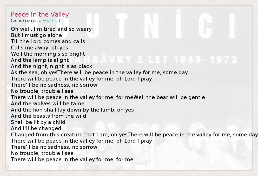 Oh well, I'm tired and so weary But I must go alone Till the Lord comes and calls Calls me away, oh yes Well the morning's so bright And the lamp is alight And the night, night is as black As the sea, oh yesThere will be peace in the valley for me, some day There will be peace in the valley for me, oh Lord I pray There'll be no sadness, no sorrow No trouble, trouble I see There will be peace in the valley for me, for meWell the bear will be gentle And the wolves will be tame And the lion shall lay down by the lamb, oh yes And the beasts from the wild Shall be lit by a child And I'll be changed Changed from this creature that I am, oh yesThere will be peace in the valley for me, some day There will be peace in the valley for me, oh Lord I pray There'll be no sadness, no sorrow No trouble, trouble I see There will be peace in the valley for me, for me