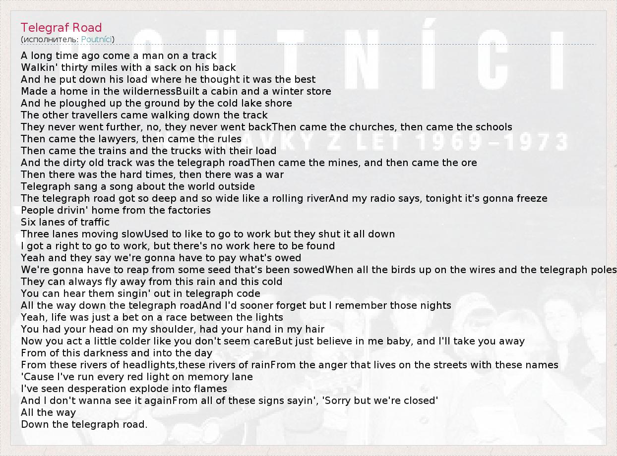 А как ты думаешь, о чем песня "Telegraf Road" ?