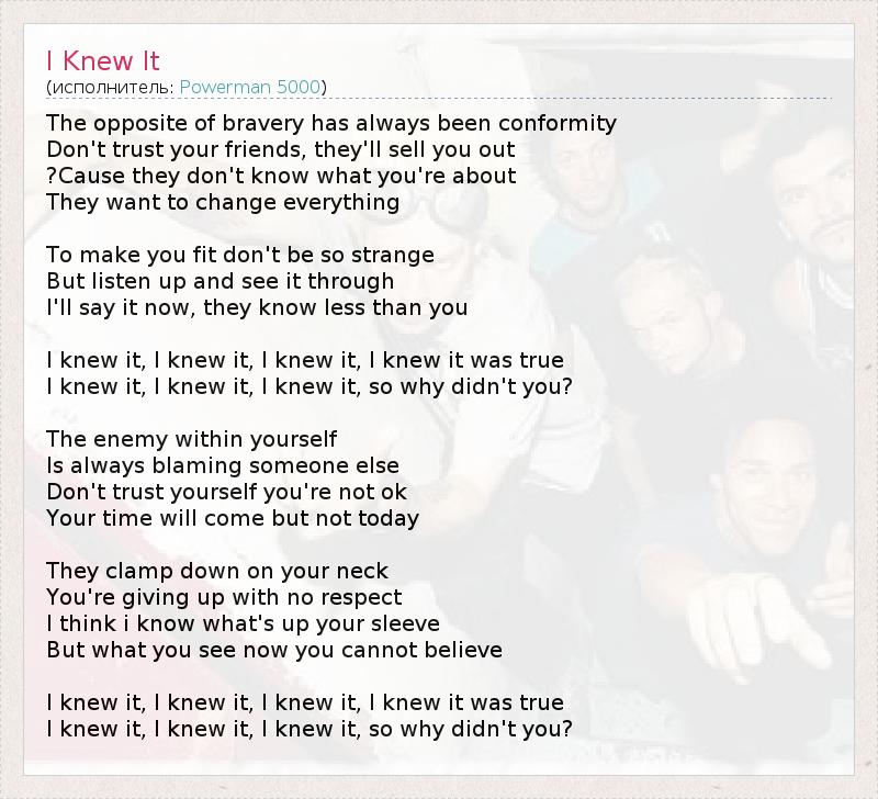 The opposite of bravery has always been conformity Don't trust your friends, they'll sell you out ?Cause they don't know what you're about They want to change everything To make you fit don't be so strange But listen up and see it through I'll say it now, they know less than you I knew it, I knew it, I knew it, I knew it was true I knew it, I knew it, I knew it, so why didn't you? The enemy within yourself Is always blaming someone else Don't trust yourself you're not ok Your time will come but not today They clamp down on your neck You're giving up with no respect I think i know what's up your sleeve But what you see now you cannot believe I knew it, I knew it, I knew it, I knew it was true I knew it, I knew it, I knew it, so why didn't you?