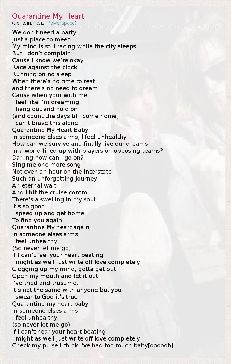 We don't need a party just a place to meet My mind is still racing while the city sleeps But I don't complain Cause I know we're okay Race against the clock Running on no sleep When there's no time to rest and there's no need to dream Cause when your with me I feel like I'm dreaming I hang out and hold on (and count the days til I come home) I can't brave this alone Quarantine My Heart Baby In someone elses arms, I feel unhealthy How can we survive and finally live our dreams In a world filled up with players on opposing teams? Darling how can I go on? Sing me one more song Not even an hour on the interstate Such an unforgetting journey An eternal wait And I hit the cruise control There's a swelling in my soul It's so good I speed up and get home To find you again Quarantine My heart again In someone elses arms I feel unhealthy (So never let me go) If I can't feel your heart beating I might as well just write off love completely Clogging up my mind, gotta get out Open my mouth and let it out I've tried and trust me, It's not the same with anyone but you I swear to God it's true Quarantine my heart baby In someone elses arms I feel unhealthy (so never let me go) If I can't hear your heart beating I might as well just write off love completely Check my pulse I think I've had too much baby[oooooh]