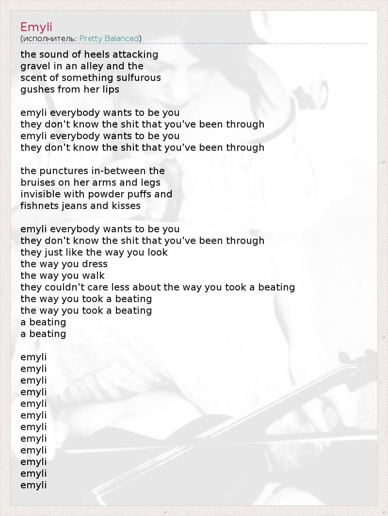 the sound of heels attacking gravel in an alley and the scent of something sulfurous gushes from her lips emyli everybody wants to be you they don't know the shit that you've been through emyli everybody wants to be you they don't know the shit that you've been through the punctures in-between the bruises on her arms and legs invisible with powder puffs and fishnets jeans and kisses emyli everybody wants to be you they don't know the shit that you've been through they just like the way you look the way you dress the way you walk they couldn't care less about the way you took a beating the way you took a beating the way you took a beating a beating a beating emyli emyli emyli emyli emyli emyli emyli emyli emyli emyli emyli emyli