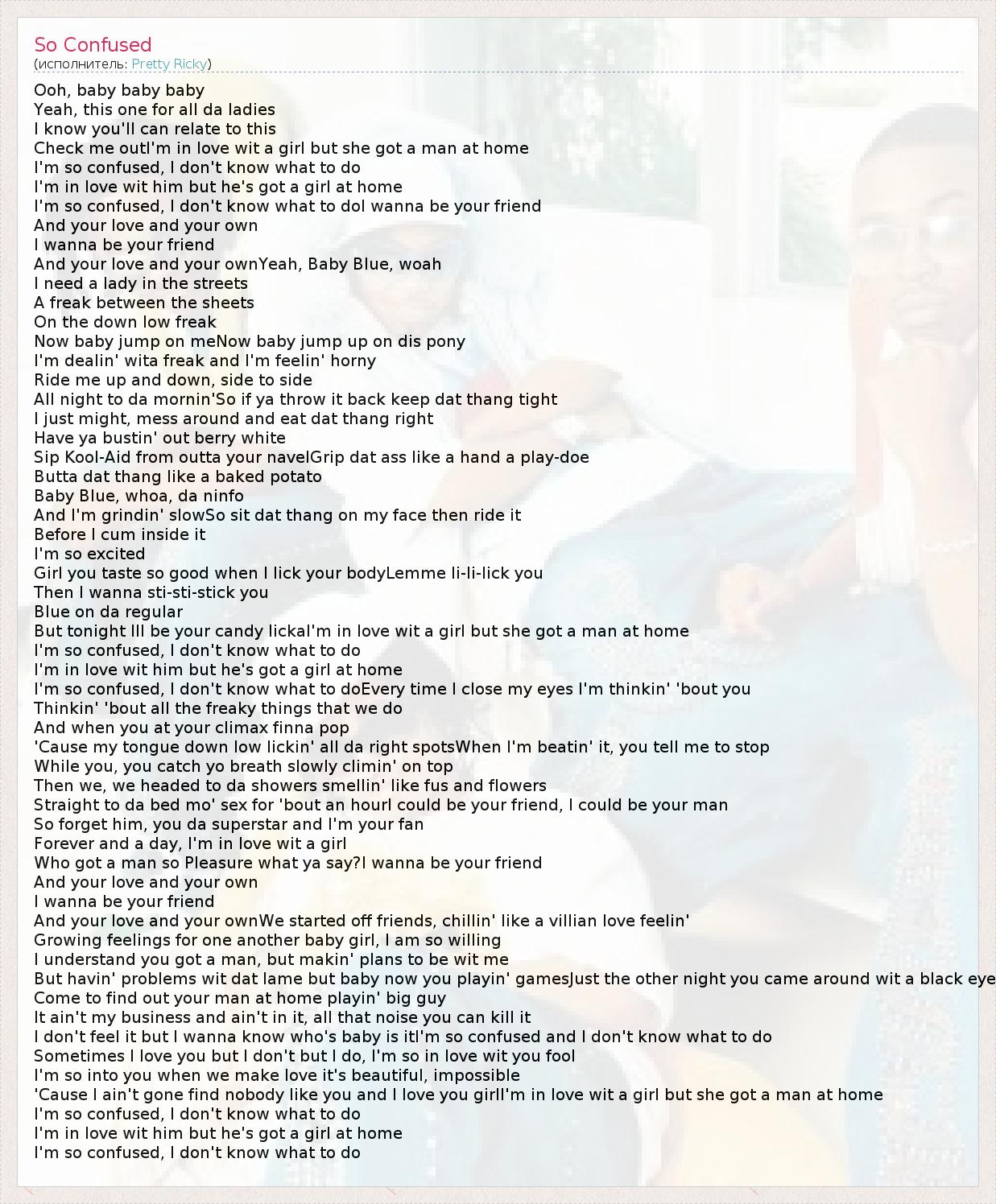Ooh, baby baby baby Yeah, this one for all da ladies I know you'll can relate to this Check me outI'm in love wit a girl but she got a man at home I'm so confused, I don't know what to do I'm in love wit him but he's got a girl at home I'm so confused, I don't know what to doI wanna be your friend And your love and your own I wanna be your friend And your love and your ownYeah, Baby Blue, woah I need a lady in the streets A freak between the sheets On the down low freak Now baby jump on meNow baby jump up on dis pony I'm dealin' wita freak and I'm feelin' horny Ride me up and down, side to side All night to da mornin'So if ya throw it back keep dat thang tight I just might, mess around and eat dat thang right Have ya bustin' out berry white Sip Kool-Aid from outta your navelGrip dat ass like a hand a play-doe Butta dat thang like a baked potato Baby Blue, whoa, da ninfo And I'm grindin' slowSo sit dat thang on my face then ride it Before I cum inside it I'm so excited Girl you taste so good when I lick your bodyLemme li-li-lick you Then I wanna sti-sti-stick you Blue on da regular But tonight Ill be your candy lickaI'm in love wit a girl but she got a man at home I'm so confused, I don't know what to do I'm in love wit him but he's got a girl at home I'm so confused, I don't know what to doEvery time I close my eyes I'm thinkin' 'bout you Thinkin' 'bout all the freaky things that we do And when you at your climax finna pop 'Cause my tongue down low lickin' all da right spotsWhen I'm beatin' it, you tell me to stop While you, you catch yo breath slowly climin' on top Then we, we headed to da showers smellin' like fus and flowers Straight to da bed mo' sex for 'bout an hourI could be your friend, I could be your man So forget him, you da superstar and I'm your fan Forever and a day, I'm in love wit a girl Who got a man so Pleasure what ya say?I wanna be your friend And your love and your own I wanna be your friend And your love and your ownWe started off friends, chillin' like a villian love feelin' Growing feelings for one another baby girl, I am so willing I understand you got a man, but makin' plans to be wit me But havin' problems wit dat lame but baby now you playin' gamesJust the other night you came around wit a black eye Come to find out your man at home playin' big guy It ain't my business and ain't in it, all that noise you can kill it I don't feel it but I wanna know who's baby is itI'm so confused and I don't know what to do Sometimes I love you but I don't but I do, I'm so in love wit you fool I'm so into you when we make love it's beautiful, impossible 'Cause I ain't gone find nobody like you and I love you girlI'm in love wit a girl but she got a man at home I'm so confused, I don't know what to do I'm in love wit him but he's got a girl at home I'm so confused, I don't know what to do