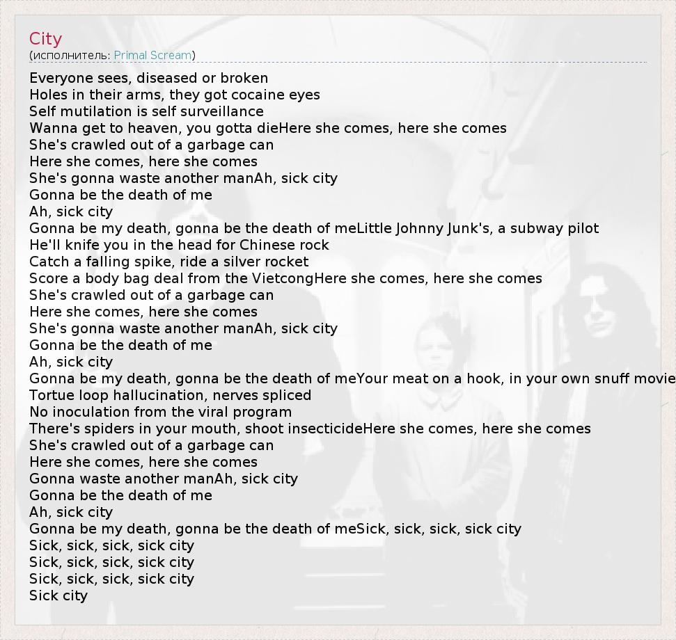 Everyone sees, diseased or broken Holes in their arms, they got cocaine eyes Self mutilation is self surveillance Wanna get to heaven, you gotta dieHere she comes, here she comes She's crawled out of a garbage can Here she comes, here she comes She's gonna waste another manAh, sick city Gonna be the death of me Ah, sick city Gonna be my death, gonna be the death of meLittle Johnny Junk's, a subway pilot He'll knife you in the head for Chinese rock Catch a falling spike, ride a silver rocket Score a body bag deal from the VietcongHere she comes, here she comes She's crawled out of a garbage can Here she comes, here she comes She's gonna waste another manAh, sick city Gonna be the death of me Ah, sick city Gonna be my death, gonna be the death of meYour meat on a hook, in your own snuff movie Tortue loop hallucination, nerves spliced No inoculation from the viral program There's spiders in your mouth, shoot insecticideHere she comes, here she comes She's crawled out of a garbage can Here she comes, here she comes Gonna waste another manAh, sick city Gonna be the death of me Ah, sick city Gonna be my death, gonna be the death of meSick, sick, sick, sick city Sick, sick, sick, sick city Sick, sick, sick, sick city Sick, sick, sick, sick city Sick city