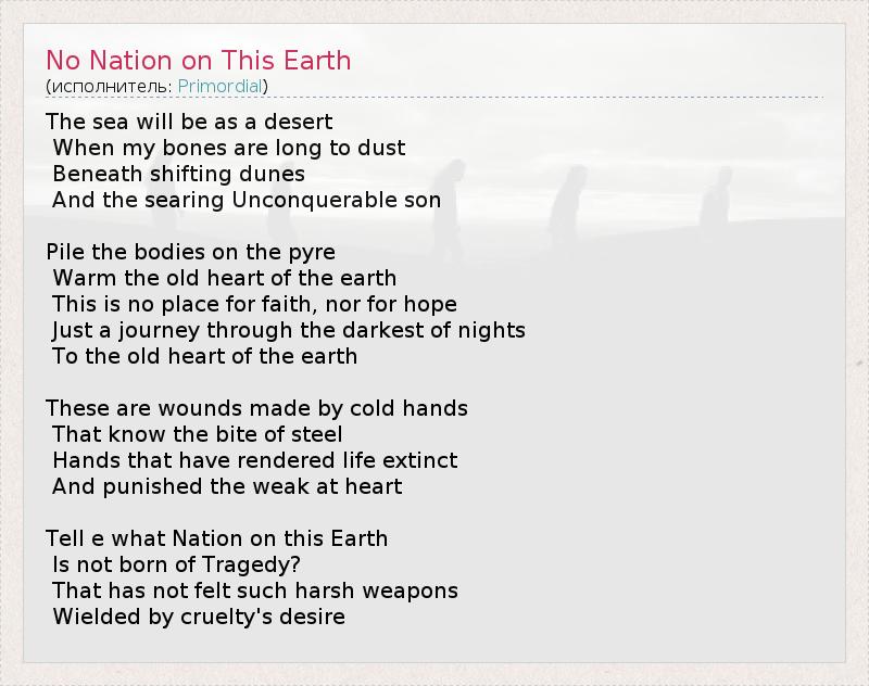 А как ты думаешь, о чем песня "No Nation on This Earth" ?