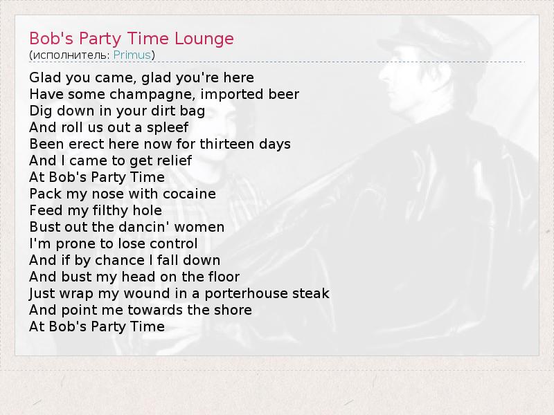 Glad you came, glad you're here Have some champagne, imported beer Dig down in your dirt bag And roll us out a spleef Been erect here now for thirteen days And I came to get relief At Bob's Party Time Pack my nose with cocaine Feed my filthy hole Bust out the dancin' women I'm prone to lose control And if by chance I fall down And bust my head on the floor Just wrap my wound in a porterhouse steak And point me towards the shore At Bob's Party Time