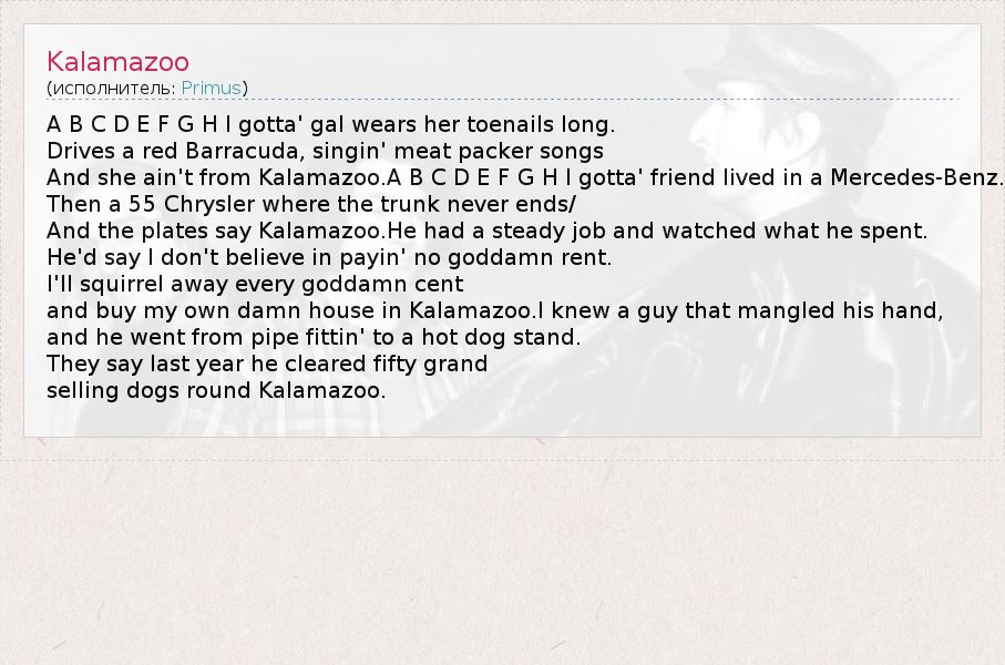 A B C D E F G H I gotta' gal wears her toenails long. Drives a red Barracuda, singin' meat packer songs And she ain't from Kalamazoo.A B C D E F G H I gotta' friend lived in a Mercedes-Benz. Then a 55 Chrysler where the trunk never ends/ And the plates say Kalamazoo.He had a steady job and watched what he spent. He'd say I don't believe in payin' no goddamn rent. I'll squirrel away every goddamn cent and buy my own damn house in Kalamazoo.I knew a guy that mangled his hand, and he went from pipe fittin' to a hot dog stand. They say last year he cleared fifty grand selling dogs round Kalamazoo.