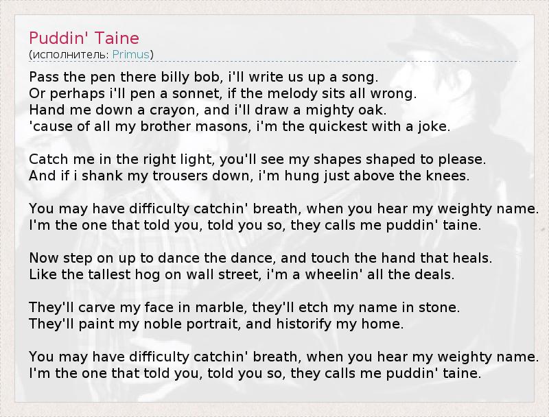 А как ты думаешь, о чем песня "Puddin' Taine" ?
