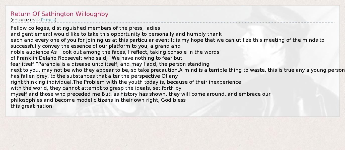 А как ты думаешь, о чем песня "Return Of Sathington Willoughby" ?