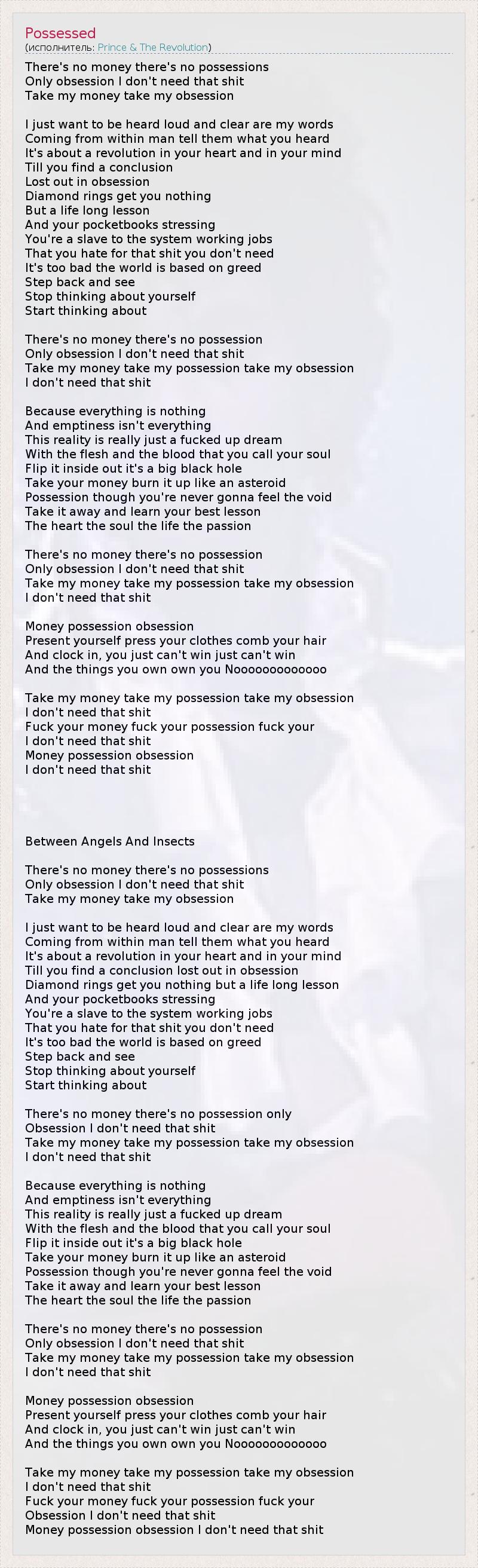 There's no money there's no possessions Only obsession I don't need that shit Take my money take my obsession I just want to be heard loud and clear are my words Coming from within man tell them what you heard It's about a revolution in your heart and in your mind Till you find a conclusion Lost out in obsession Diamond rings get you nothing But a life long lesson And your pocketbooks stressing You're a slave to the system working jobs That you hate for that shit you don't need It's too bad the world is based on greed Step back and see Stop thinking about yourself Start thinking about There's no money there's no possession Only obsession I don't need that shit Take my money take my possession take my obsession I don't need that shit Because everything is nothing And emptiness isn't everything This reality is really just a fucked up dream With the flesh and the blood that you call your soul Flip it inside out it's a big black hole Take your money burn it up like an asteroid Possession though you're never gonna feel the void Take it away and learn your best lesson The heart the soul the life the passion There's no money there's no possession Only obsession I don't need that shit Take my money take my possession take my obsession I don't need that shit Money possession obsession Present yourself press your clothes comb your hair And clock in, you just can't win just can't win And the things you own own you Nooooooooooooo Take my money take my possession take my obsession I don't need that shit Fuck your money fuck your possession fuck your I don't need that shit Money possession obsession I don't need that shit Between Angels And Insects There's no money there's no possessions Only obsession I don't need that shit Take my money take my obsession I just want to be heard loud and clear are my words Coming from within man tell them what you heard It's about a revolution in your heart and in your mind Till you find a conclusion lost out in obsession Diamond rings get you nothing but a life long lesson And your pocketbooks stressing You're a slave to the system working jobs That you hate for that shit you don't need It's too bad the world is based on greed Step back and see Stop thinking about yourself Start thinking about There's no money there's no possession only Obsession I don't need that shit Take my money take my possession take my obsession I don't need that shit Because everything is nothing And emptiness isn't everything This reality is really just a fucked up dream With the flesh and the blood that you call your soul Flip it inside out it's a big black hole Take your money burn it up like an asteroid Possession though you're never gonna feel the void Take it away and learn your best lesson The heart the soul the life the passion There's no money there's no possession Only obsession I don't need that shit Take my money take my possession take my obsession I don't need that shit Money possession obsession Present yourself press your clothes comb your hair And clock in, you just can't win just can't win And the things you own own you Nooooooooooooo Take my money take my possession take my obsession I don't need that shit Fuck your money fuck your possession fuck your Obsession I don't need that shit Money possession obsession I don't need that shit