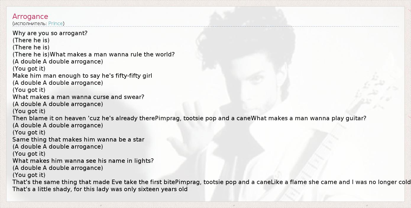 Why are you so arrogant? (There he is) (There he is) (There he is)What makes a man wanna rule the world? (A double A double arrogance) (You got it) Make him man enough to say he's fifty-fifty girl (A double A double arrogance) (You got it) What makes a man wanna curse and swear? (A double A double arrogance) (You got it) Then blame it on heaven 'cuz he's already therePimprag, tootsie pop and a caneWhat makes a man wanna play guitar? (A double A double arrogance) (You got it) Same thing that makes him wanna be a star (A double A double arrogance) (You got it) What makes him wanna see his name in lights? (A double A double arrogance) (You got it) That's the same thing that made Eve take the first bitePimprag, tootsie pop and a caneLike a flame she came and I was no longer cold That's a little shady, for this lady was only sixteen years old