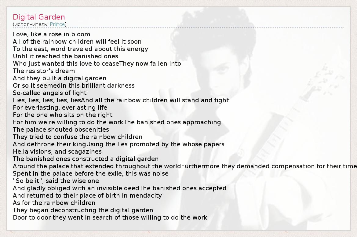 Love, like a rose in bloom All of the rainbow children will feel it soon To the east, word traveled about this energy Until it reached the banished ones Who just wanted this love to ceaseThey now fallen into The resistor's dream And they built a digital garden Or so it seemedIn this brilliant darkness So-called angels of light Lies, lies, lies, lies, liesAnd all the rainbow children will stand and fight For everlasting, everlasting life For the one who sits on the right For him we're willing to do the workThe banished ones approaching The palace shouted obscenities They tried to confuse the rainbow children And dethrone their kingUsing the lies promoted by the whose papers Hella visions, and scagazines The banished ones constructed a digital garden Around the palace that extended throughout the worldFurthermore they demanded compensation for their time Spent in the palace before the exile, this was noise "So be it", said the wise one And gladly obliged with an invisible deedThe banished ones accepted And returned to their place of birth in mendacity As for the rainbow children They began deconstructing the digital garden Door to door they went in search of those willing to do the work