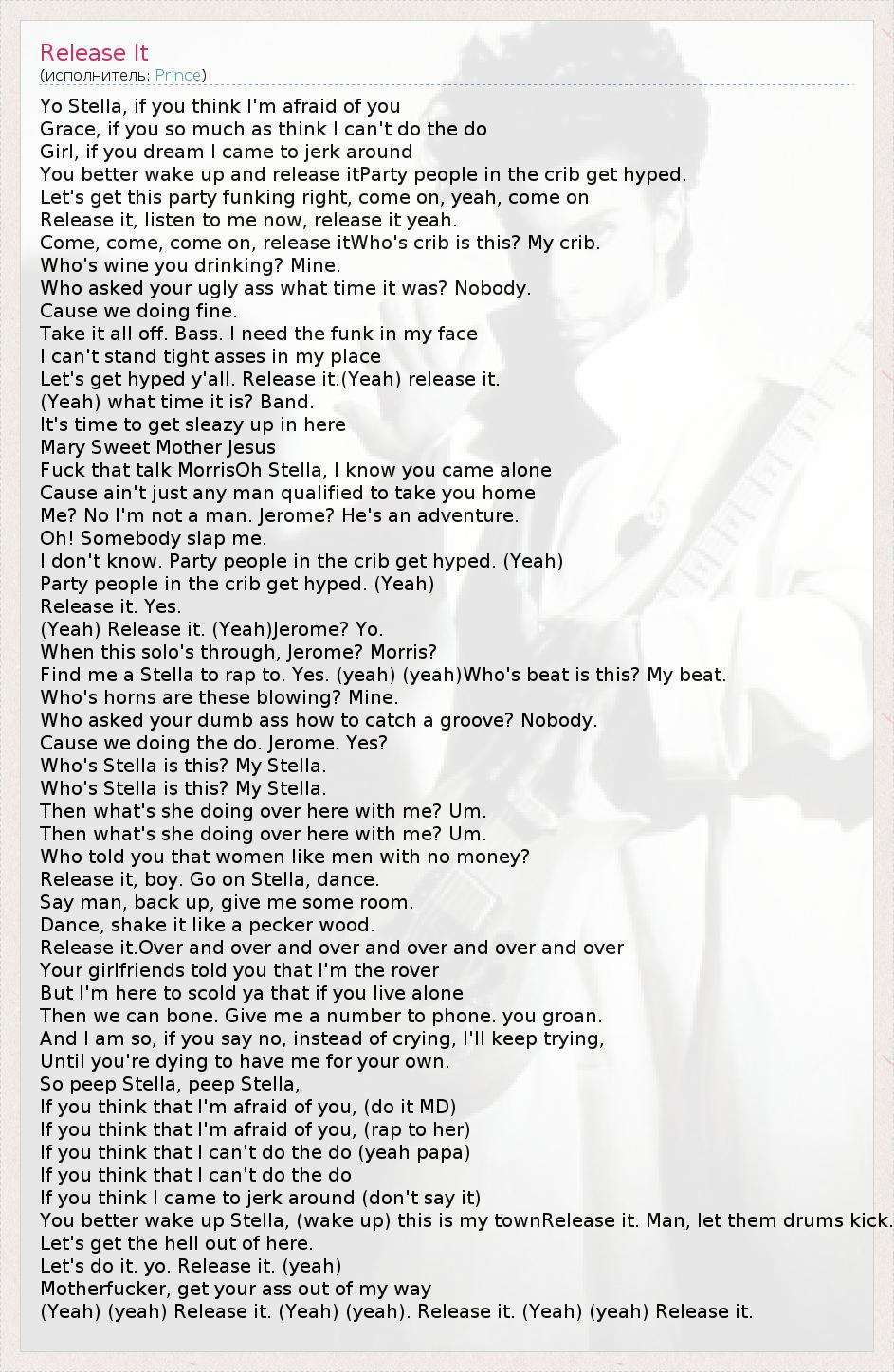 Yo Stella, if you think I'm afraid of you Grace, if you so much as think I can't do the do Girl, if you dream I came to jerk around You better wake up and release itParty people in the crib get hyped. Let's get this party funking right, come on, yeah, come on Release it, listen to me now, release it yeah. Come, come, come on, release itWho's crib is this? My crib. Who's wine you drinking? Mine. Who asked your ugly ass what time it was? Nobody. Cause we doing fine. Take it all off. Bass. I need the funk in my face I can't stand tight asses in my place Let's get hyped y'all. Release it.(Yeah) release it. (Yeah) what time it is? Band. It's time to get sleazy up in here Mary Sweet Mother Jesus Fuck that talk MorrisOh Stella, I know you came alone Cause ain't just any man qualified to take you home Me? No I'm not a man. Jerome? He's an adventure. Oh! Somebody slap me. I don't know. Party people in the crib get hyped. (Yeah) Party people in the crib get hyped. (Yeah) Release it. Yes. (Yeah) Release it. (Yeah)Jerome? Yo. When this solo's through, Jerome? Morris? Find me a Stella to rap to. Yes. (yeah) (yeah)Who's beat is this? My beat. Who's horns are these blowing? Mine. Who asked your dumb ass how to catch a groove? Nobody. Cause we doing the do. Jerome. Yes? Who's Stella is this? My Stella. Who's Stella is this? My Stella. Then what's she doing over here with me? Um. Then what's she doing over here with me? Um. Who told you that women like men with no money? Release it, boy. Go on Stella, dance. Say man, back up, give me some room. Dance, shake it like a pecker wood. Release it.Over and over and over and over and over and over Your girlfriends told you that I'm the rover But I'm here to scold ya that if you live alone Then we can bone. Give me a number to phone. you groan. And I am so, if you say no, instead of crying, I'll keep trying, Until you're dying to have me for your own. So peep Stella, peep Stella, If you think that I'm afraid of you, (do it MD) If you think that I'm afraid of you, (rap to her) If you think that I can't do the do (yeah papa) If you think that I can't do the do If you think I came to jerk around (don't say it) You better wake up Stella, (wake up) this is my townRelease it. Man, let them drums kick. Let's get the hell out of here. Let's do it. yo. Release it. (yeah) Motherfucker, get your ass out of my way (Yeah) (yeah) Release it. (Yeah) (yeah). Release it. (Yeah) (yeah) Release it.