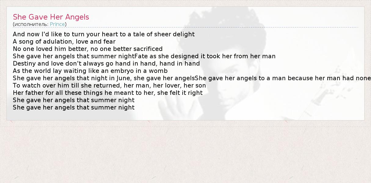 А как ты думаешь, о чем песня "She Gave Her Angels" ?