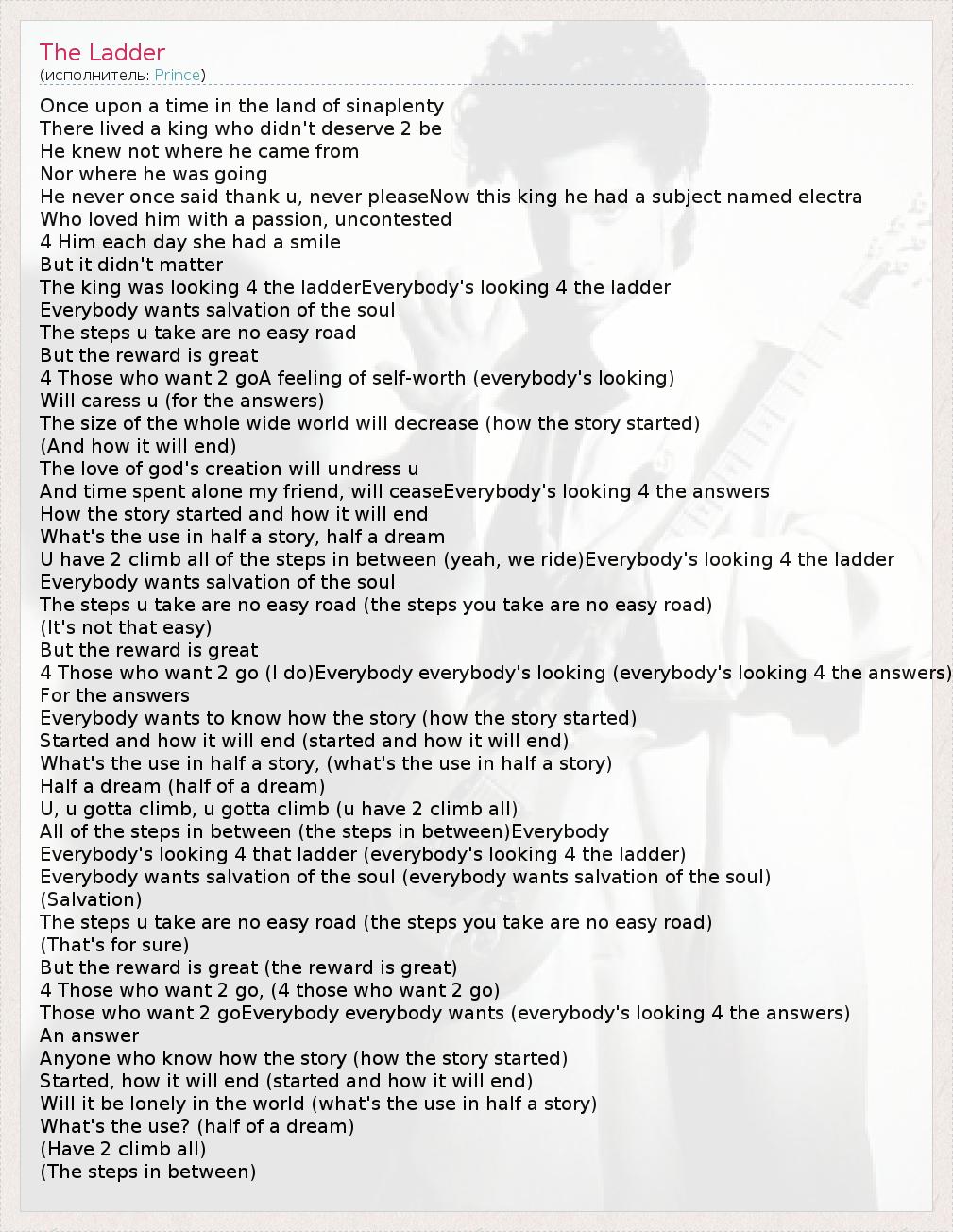 Once upon a time in the land of sinaplenty There lived a king who didn't deserve 2 be He knew not where he came from Nor where he was going He never once said thank u, never pleaseNow this king he had a subject named electra Who loved him with a passion, uncontested 4 Him each day she had a smile But it didn't matter The king was looking 4 the ladderEverybody's looking 4 the ladder Everybody wants salvation of the soul The steps u take are no easy road But the reward is great 4 Those who want 2 goA feeling of self-worth (everybody's looking) Will caress u (for the answers) The size of the whole wide world will decrease (how the story started) (And how it will end) The love of god's creation will undress u And time spent alone my friend, will ceaseEverybody's looking 4 the answers How the story started and how it will end What's the use in half a story, half a dream U have 2 climb all of the steps in between (yeah, we ride)Everybody's looking 4 the ladder Everybody wants salvation of the soul The steps u take are no easy road (the steps you take are no easy road) (It's not that easy) But the reward is great 4 Those who want 2 go (I do)Everybody everybody's looking (everybody's looking 4 the answers) For the answers Everybody wants to know how the story (how the story started) Started and how it will end (started and how it will end) What's the use in half a story, (what's the use in half a story) Half a dream (half of a dream) U, u gotta climb, u gotta climb (u have 2 climb all) All of the steps in between (the steps in between)Everybody Everybody's looking 4 that ladder (everybody's looking 4 the ladder) Everybody wants salvation of the soul (everybody wants salvation of the soul) (Salvation) The steps u take are no easy road (the steps you take are no easy road) (That's for sure) But the reward is great (the reward is great) 4 Those who want 2 go, (4 those who want 2 go) Those who want 2 goEverybody everybody wants (everybody's looking 4 the answers) An answer Anyone who know how the story (how the story started) Started, how it will end (started and how it will end) Will it be lonely in the world (what's the use in half a story) What's the use? (half of a dream) (Have 2 climb all) (The steps in between)