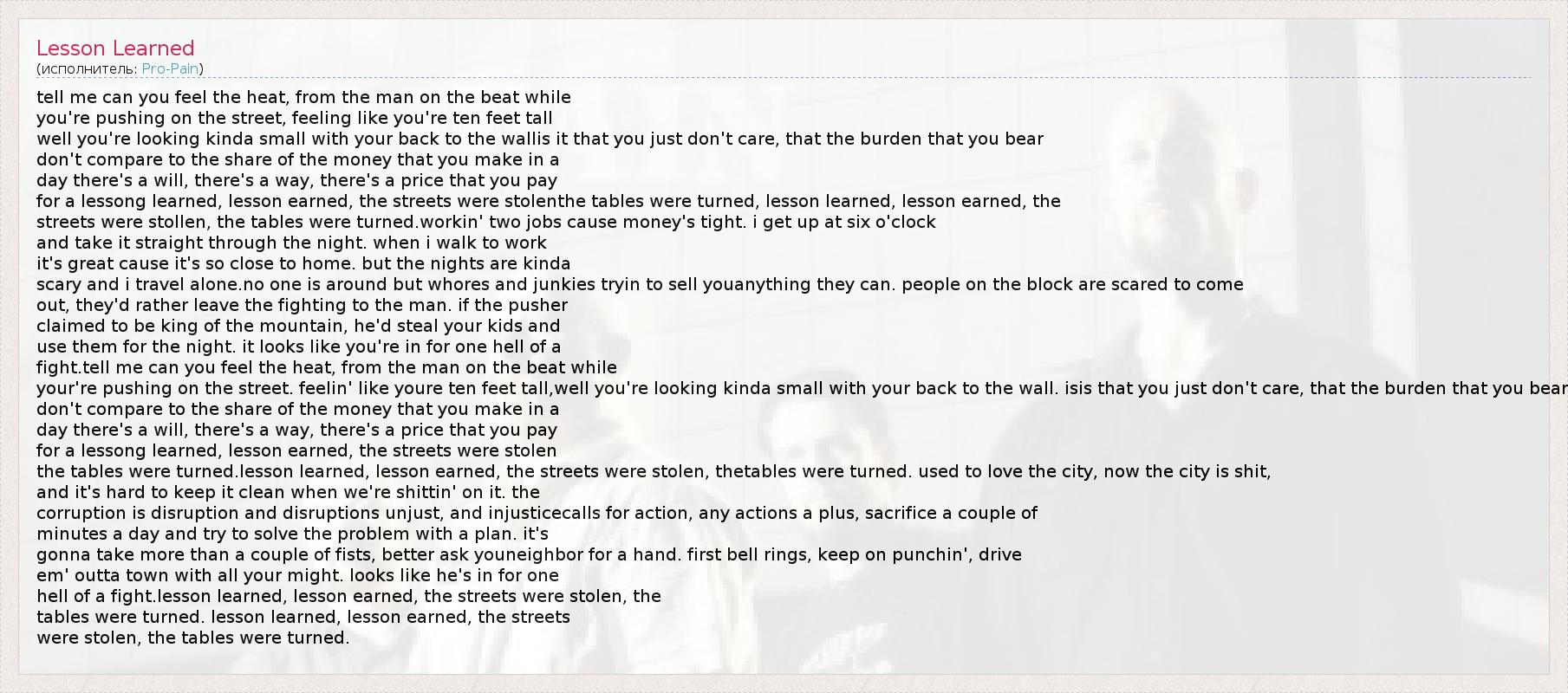 tell me can you feel the heat, from the man on the beat while you're pushing on the street, feeling like you're ten feet tall well you're looking kinda small with your back to the wallis it that you just don't care, that the burden that you bear don't compare to the share of the money that you make in a day there's a will, there's a way, there's a price that you pay for a lessong learned, lesson earned, the streets were stolenthe tables were turned, lesson learned, lesson earned, the streets were stollen, the tables were turned.workin' two jobs cause money's tight. i get up at six o'clock and take it straight through the night. when i walk to work it's great cause it's so close to home. but the nights are kinda scary and i travel alone.no one is around but whores and junkies tryin to sell youanything they can. people on the block are scared to come out, they'd rather leave the fighting to the man. if the pusher claimed to be king of the mountain, he'd steal your kids and use them for the night. it looks like you're in for one hell of a fight.tell me can you feel the heat, from the man on the beat while your're pushing on the street. feelin' like youre ten feet tall,well you're looking kinda small with your back to the wall. isis that you just don't care, that the burden that you bear don't compare to the share of the money that you make in a day there's a will, there's a way, there's a price that you pay for a lessong learned, lesson earned, the streets were stolen the tables were turned.lesson learned, lesson earned, the streets were stolen, thetables were turned. used to love the city, now the city is shit, and it's hard to keep it clean when we're shittin' on it. the corruption is disruption and disruptions unjust, and injusticecalls for action, any actions a plus, sacrifice a couple of minutes a day and try to solve the problem with a plan. it's gonna take more than a couple of fists, better ask youneighbor for a hand. first bell rings, keep on punchin', drive em' outta town with all your might. looks like he's in for one hell of a fight.lesson learned, lesson earned, the streets were stolen, the tables were turned. lesson learned, lesson earned, the streets were stolen, the tables were turned.