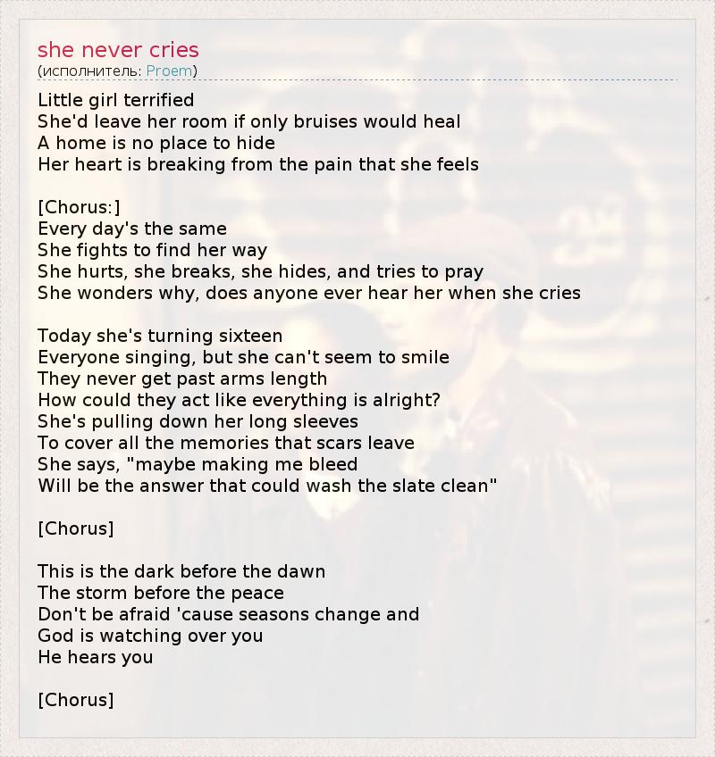 Ей больно, она сломлена, она скрывается, пытается молиться.