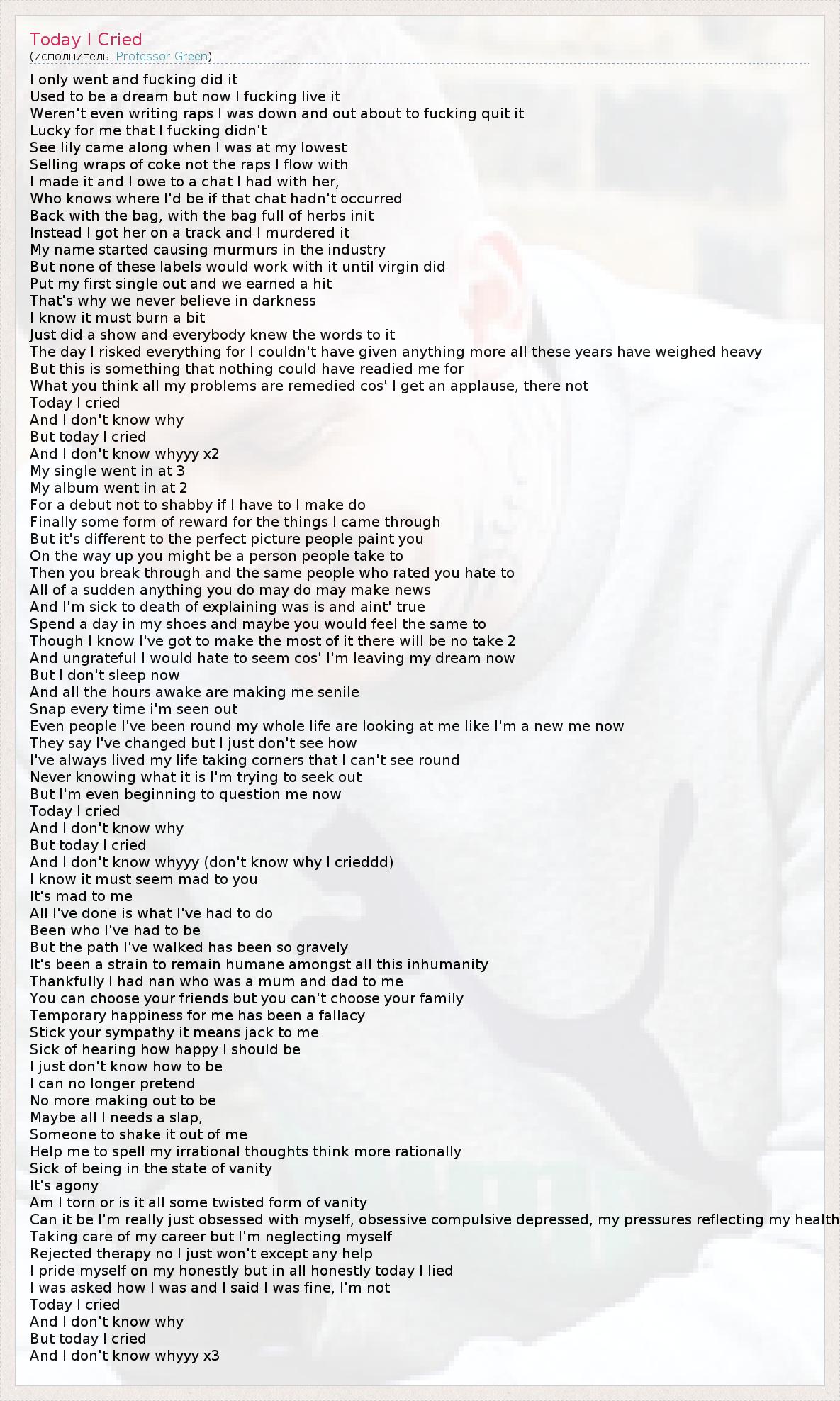 I only went and fucking did it Used to be a dream but now I fucking live it Weren't even writing raps I was down and out about to fucking quit it Lucky for me that I fucking didn't See lily came along when I was at my lowest Selling wraps of coke not the raps I flow with I made it and I owe to a chat I had with her, Who knows where I'd be if that chat hadn't occurred Back with the bag, with the bag full of herbs init Instead I got her on a track and I murdered it My name started causing murmurs in the industry But none of these labels would work with it until virgin did Put my first single out and we earned a hit That's why we never believe in darkness I know it must burn a bit Just did a show and everybody knew the words to it The day I risked everything for I couldn't have given anything more all these years have weighed heavy But this is something that nothing could have readied me for What you think all my problems are remedied cos' I get an applause, there not Today I cried And I don't know why But today I cried And I don't know whyyy x2 My single went in at 3 My album went in at 2 For a debut not to shabby if I have to I make do Finally some form of reward for the things I came through But it's different to the perfect picture people paint you On the way up you might be a person people take to Then you break through and the same people who rated you hate to All of a sudden anything you do may do may make news And I'm sick to death of explaining was is and aint' true Spend a day in my shoes and maybe you would feel the same to Though I know I've got to make the most of it there will be no take 2 And ungrateful I would hate to seem cos' I'm leaving my dream now But I don't sleep now And all the hours awake are making me senile Snap every time i'm seen out Even people I've been round my whole life are looking at me like I'm a new me now They say I've changed but I just don't see how I've always lived my life taking corners that I can't see round Never knowing what it is I'm trying to seek out But I'm even beginning to question me now Today I cried And I don't know why But today I cried And I don't know whyyy (don't know why I crieddd) I know it must seem mad to you It's mad to me All I've done is what I've had to do Been who I've had to be But the path I've walked has been so gravely It's been a strain to remain humane amongst all this inhumanity Thankfully I had nan who was a mum and dad to me You can choose your friends but you can't choose your family Temporary happiness for me has been a fallacy Stick your sympathy it means jack to me Sick of hearing how happy I should be I just don't know how to be I can no longer pretend No more making out to be Maybe all I needs a slap, Someone to shake it out of me Help me to spell my irrational thoughts think more rationally Sick of being in the state of vanity It's agony Am I torn or is it all some twisted form of vanity Can it be I'm really just obsessed with myself, obsessive compulsive depressed, my pressures reflecting my health Taking care of my career but I'm neglecting myself Rejected therapy no I just won't except any help I pride myself on my honestly but in all honestly today I lied I was asked how I was and I said I was fine, I'm not Today I cried And I don't know why But today I cried And I don't know whyyy x3