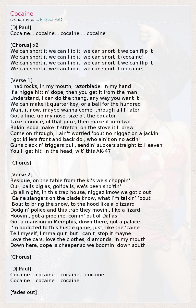 Это интересно:Patrick Rasheed Houston родился в 1972 году в Мемфисе, Теннесси. В начале 90х DJ Paul & Juicy J (кстати брат Project Pat'a) создают группу под названием Three 6 Mafia (666 Mafia кто не понял). Pat присоедяется к группе на 2 альбома, после чего записывает свой сольный альбом "Gretty Green". До записи альбома у "Мафии" был бифф с легендарной на сегодяшний день MidWest группой Bone Thugs-N-Harmony. А началось всё из-за того, что Bone Thugs начинают... продолжение