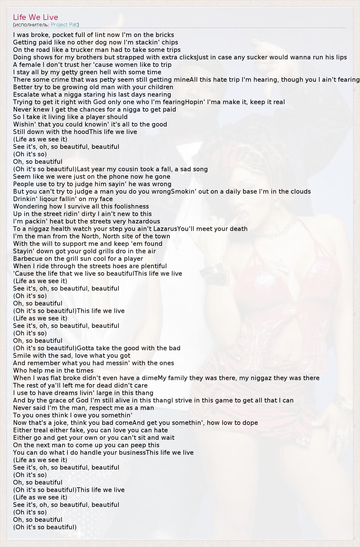 Это интересно:Patrick Rasheed Houston родился в 1972 году в Мемфисе, Теннесси. В начале 90х DJ Paul & Juicy J (кстати брат Project Pat'a) создают группу под названием Three 6 Mafia (666 Mafia кто не понял). Pat присоедяется к группе на 2 альбома, после чего записывает свой сольный альбом "Gretty Green". До записи альбома у "Мафии" был бифф с легендарной на сегодяшний день MidWest группой Bone Thugs-N-Harmony. А началось всё из-за того, что Bone Thugs начинают... продолжение