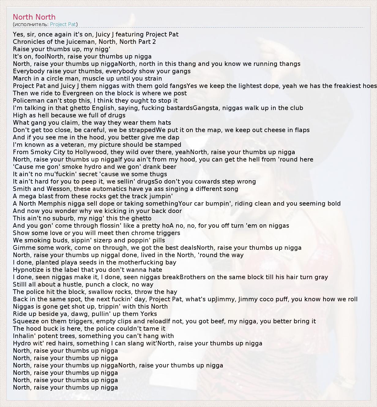 Это интересно:Patrick Rasheed Houston родился в 1972 году в Мемфисе, Теннесси. В начале 90х DJ Paul & Juicy J (кстати брат Project Pat'a) создают группу под названием Three 6 Mafia (666 Mafia кто не понял). Pat присоедяется к группе на 2 альбома, после чего записывает свой сольный альбом "Gretty Green". До записи альбома у "Мафии" был бифф с легендарной на сегодяшний день MidWest группой Bone Thugs-N-Harmony. А началось всё из-за того, что Bone Thugs начинают... продолжение