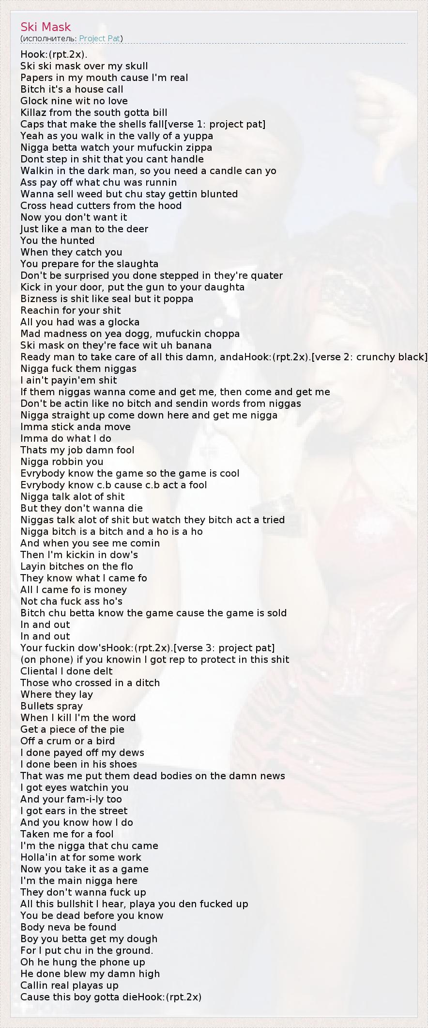 Hook:(rpt.2x). Ski ski mask over my skull Papers in my mouth cause I'm real Bitch it's a house call Glock nine wit no love Killaz from the south gotta bill Caps that make the shells fall[verse 1: project pat] Yeah as you walk in the vally of a yuppa Nigga betta watch your mufuckin zippa Dont step in shit that you cant handle Walkin in the dark man, so you need a candle can yo Ass pay off what chu was runnin Wanna sell weed but chu stay gettin blunted Cross head cutters from the hood Now you don't want it Just like a man to the deer You the hunted When they catch you You prepare for the slaughta Don't be surprised you done stepped in they're quater Kick in your door, put the gun to your daughta Bizness is shit like seal but it poppa Reachin for your shit All you had was a glocka Mad madness on yea dogg, mufuckin choppa Ski mask on they're face wit uh banana Ready man to take care of all this damn, andaHook:(rpt.2x).[verse 2: crunchy black] Nigga fuck them niggas I ain't payin'em shit If them niggas wanna come and get me, then come and get me Don't be actin like no bitch and sendin words from niggas Nigga straight up come down here and get me nigga Imma stick anda move Imma do what I do Thats my job damn fool Nigga robbin you Evrybody know the game so the game is cool Evrybody know c.b cause c.b act a fool Nigga talk alot of shit But they don't wanna die Niggas talk alot of shit but watch they bitch act a tried Nigga bitch is a bitch and a ho is a ho And when you see me comin Then I'm kickin in dow's Layin bitches on the flo They know what I came fo All I came fo is money Not cha fuck ass ho's Bitch chu betta know the game cause the game is sold In and out In and out Your fuckin dow'sHook:(rpt.2x).[verse 3: project pat] (on phone) if you knowin I got rep to protect in this shit Cliental I done delt Those who crossed in a ditch Where they lay Bullets spray When I kill I'm the word Get a piece of the pie Off a crum or a bird I done payed off my dews I done been in his shoes That was me put them dead bodies on the damn news I got eyes watchin you And your fam-i-ly too I got ears in the street And you know how I do Taken me for a fool I'm the nigga that chu came Holla'in at for some work Now you take it as a game I'm the main nigga here They don't wanna fuck up All this bullshit I hear, playa you den fucked up You be dead before you know Body neva be found Boy you betta get my dough For I put chu in the ground. Oh he hung the phone up He done blew my damn high Callin real playas up Cause this boy gotta dieHook:(rpt.2x)