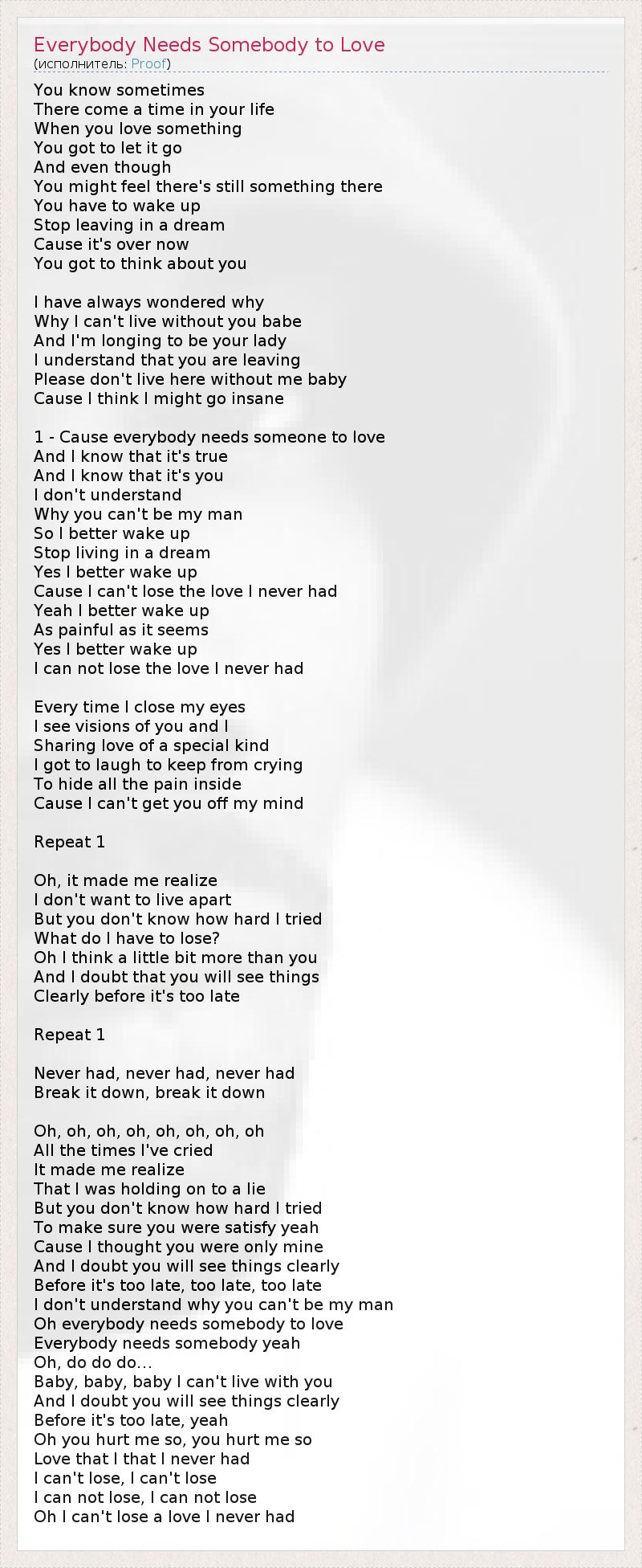 You know sometimes There come a time in your life When you love something You got to let it go And even though You might feel there's still something there You have to wake up Stop leaving in a dream Cause it's over now You got to think about you I have always wondered why Why I can't live without you babe And I'm longing to be your lady I understand that you are leaving Please don't live here without me baby Cause I think I might go insane 1 - Cause everybody needs someone to love And I know that it's true And I know that it's you I don't understand Why you can't be my man So I better wake up Stop living in a dream Yes I better wake up Cause I can't lose the love I never had Yeah I better wake up As painful as it seems Yes I better wake up I can not lose the love I never had Every time I close my eyes I see visions of you and I Sharing love of a special kind I got to laugh to keep from crying To hide all the pain inside Cause I can't get you off my mind Repeat 1 Oh, it made me realize I don't want to live apart But you don't know how hard I tried What do I have to lose? Oh I think a little bit more than you And I doubt that you will see things Clearly before it's too late Repeat 1 Never had, never had, never had Break it down, break it down Oh, oh, oh, oh, oh, oh, oh, oh All the times I've cried It made me realize That I was holding on to a lie But you don't know how hard I tried To make sure you were satisfy yeah Cause I thought you were only mine And I doubt you will see things clearly Before it's too late, too late, too late I don't understand why you can't be my man Oh everybody needs somebody to love Everybody needs somebody yeah Oh, do do do… Baby, baby, baby I can't live with you And I doubt you will see things clearly Before it's too late, yeah Oh you hurt me so, you hurt me so Love that I that I never had I can't lose, I can't lose I can not lose, I can not lose Oh I can't lose a love I never had
