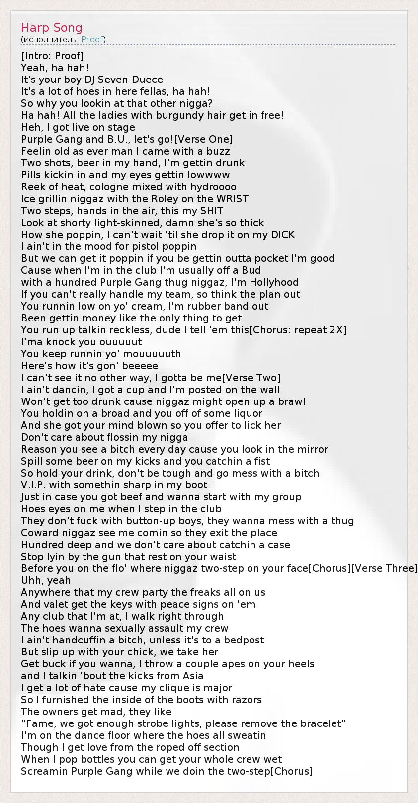 [Intro: Proof] Yeah, ha hah! It's your boy DJ Seven-Duece It's a lot of hoes in here fellas, ha hah! So why you lookin at that other nigga? Ha hah! All the ladies with burgundy hair get in free! Heh, I got live on stage Purple Gang and B.U., let's go![Verse One] Feelin old as ever man I came with a buzz Two shots, beer in my hand, I'm gettin drunk Pills kickin in and my eyes gettin lowwww Reek of heat, cologne mixed with hydroooo Ice grillin niggaz with the Roley on the WRIST Two steps, hands in the air, this my SHIT Look at shorty light-skinned, damn she's so thick How she poppin, I can't wait 'til she drop it on my DICK I ain't in the mood for pistol poppin But we can get it poppin if you be gettin outta pocket I'm good Cause when I'm in the club I'm usually off a Bud with a hundred Purple Gang thug niggaz, I'm Hollyhood If you can't really handle my team, so think the plan out You runnin low on yo' cream, I'm rubber band out Been gettin money like the only thing to get You run up talkin reckless, dude I tell 'em this[Chorus: repeat 2X] I'ma knock you ouuuuut You keep runnin yo' mouuuuuth Here's how it's gon' beeeee I can't see it no other way, I gotta be me[Verse Two] I ain't dancin, I got a cup and I'm posted on the wall Won't get too drunk cause niggaz might open up a brawl You holdin on a broad and you off of some liquor And she got your mind blown so you offer to lick her Don't care about flossin my nigga Reason you see a bitch every day cause you look in the mirror Spill some beer on my kicks and you catchin a fist So hold your drink, don't be tough and go mess with a bitch V.I.P. with somethin sharp in my boot Just in case you got beef and wanna start with my group Hoes eyes on me when I step in the club They don't fuck with button-up boys, they wanna mess with a thug Coward niggaz see me comin so they exit the place Hundred deep and we don't care about catchin a case Stop lyin by the gun that rest on your waist Before you on the flo' where niggaz two-step on your face[Chorus][Verse Three] Uhh, yeah Anywhere that my crew party the freaks all on us And valet get the keys with peace signs on 'em Any club that I'm at, I walk right through The hoes wanna sexually assault my crew I ain't handcuffin a bitch, unless it's to a bedpost But slip up with your chick, we take her Get buck if you wanna, I throw a couple apes on your heels and I talkin 'bout the kicks from Asia I get a lot of hate cause my clique is major So I furnished the inside of the boots with razors The owners get mad, they like "Fame, we got enough strobe lights, please remove the bracelet" I'm on the dance floor where the hoes all sweatin Though I get love from the roped off section When I pop bottles you can get your whole crew wet Screamin Purple Gang while we doin the two-step[Chorus]