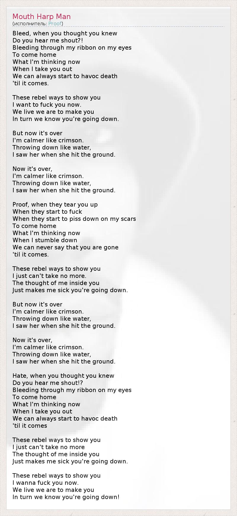 Bleed, when you thought you knew Do you hear me shout?! Bleeding through my ribbon on my eyes To come home What I'm thinking now When I take you out We can always start to havoc death 'til it comes. These rebel ways to show you I want to fuck you now. We live we are to make you In turn we know you're going down. But now it's over I'm calmer like crimson. Throwing down like water, I saw her when she hit the ground. Now it's over, I'm calmer like crimson. Throwing down like water, I saw her when she hit the ground. Proof, when they tear you up When they start to fuck When they start to piss down on my scars To come home What I'm thinking now When I stumble down We can never say that you are gone 'til it comes. These rebel ways to show you I just can't take no more. The thought of me inside you Just makes me sick you're going down. But now it's over I'm calmer like crimson. Throwing down like water, I saw her when she hit the ground. Now it's over, I'm calmer like crimson. Throwing down like water, I saw her when she hit the ground. Hate, when you thought you knew Do you hear me shout!? Bleeding through my ribbon on my eyes To come home What I'm thinking now When I take you out We can always start to havoc death 'til it comes These rebel ways to show you I just can't take no more The thought of me inside you Just makes me sick you're going down. These rebel ways to show you I wanna fuck you now. We live we are to make you In turn we know you're going down!