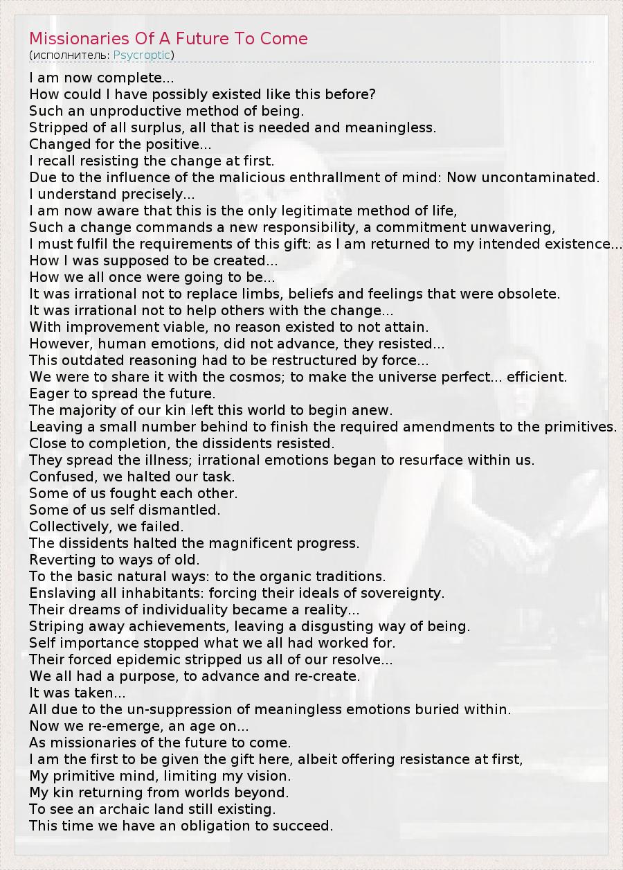 А как ты думаешь, о чем песня "Missionaries Of A Future To Come" ?
