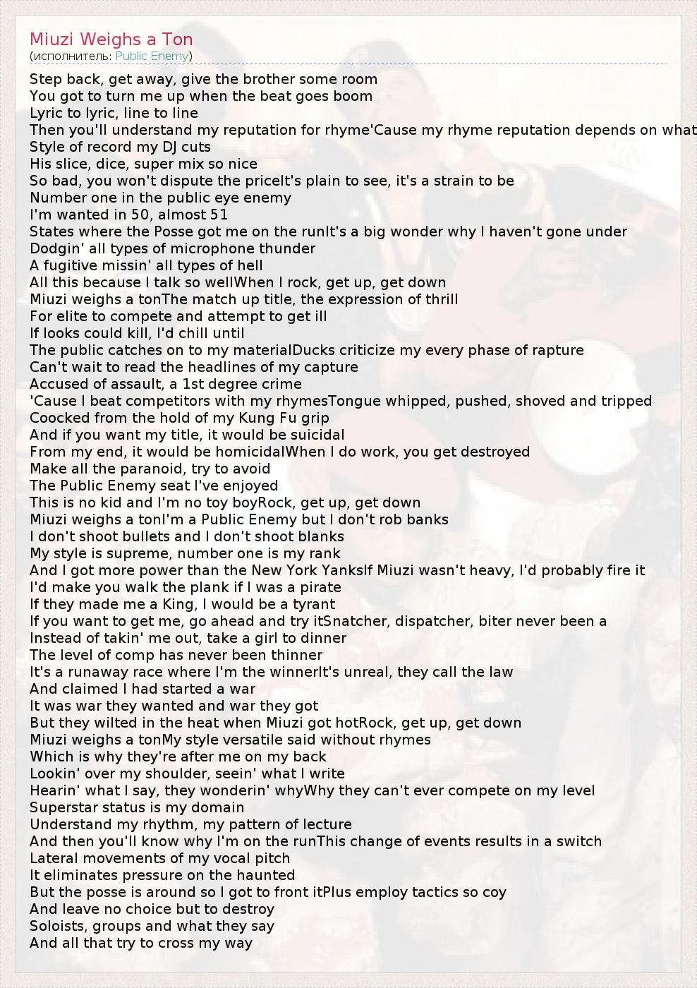 Step back, get away, give the brother some room You got to turn me up when the beat goes boom Lyric to lyric, line to line Then you'll understand my reputation for rhyme'Cause my rhyme reputation depends on what Style of record my DJ cuts His slice, dice, super mix so nice So bad, you won't dispute the priceIt's plain to see, it's a strain to be Number one in the public eye enemy I'm wanted in 50, almost 51 States where the Posse got me on the runIt's a big wonder why I haven't gone under Dodgin' all types of microphone thunder A fugitive missin' all types of hell All this because I talk so wellWhen I rock, get up, get down Miuzi weighs a tonThe match up title, the expression of thrill For elite to compete and attempt to get ill If looks could kill, I'd chill until The public catches on to my materialDucks criticize my every phase of rapture Can't wait to read the headlines of my capture Accused of assault, a 1st degree crime 'Cause I beat competitors with my rhymesTongue whipped, pushed, shoved and tripped Coocked from the hold of my Kung Fu grip And if you want my title, it would be suicidal From my end, it would be homicidalWhen I do work, you get destroyed Make all the paranoid, try to avoid The Public Enemy seat I've enjoyed This is no kid and I'm no toy boyRock, get up, get down Miuzi weighs a tonI'm a Public Enemy but I don't rob banks I don't shoot bullets and I don't shoot blanks My style is supreme, number one is my rank And I got more power than the New York YanksIf Miuzi wasn't heavy, I'd probably fire it I'd make you walk the plank if I was a pirate If they made me a King, I would be a tyrant If you want to get me, go ahead and try itSnatcher, dispatcher, biter never been a Instead of takin' me out, take a girl to dinner The level of comp has never been thinner It's a runaway race where I'm the winnerIt's unreal, they call the law And claimed I had started a war It was war they wanted and war they got But they wilted in the heat when Miuzi got hotRock, get up, get down Miuzi weighs a tonMy style versatile said without rhymes Which is why they're after me on my back Lookin' over my shoulder, seein' what I write Hearin' what I say, they wonderin' whyWhy they can't ever compete on my level Superstar status is my domain Understand my rhythm, my pattern of lecture And then you'll know why I'm on the runThis change of events results in a switch Lateral movements of my vocal pitch It eliminates pressure on the haunted But the posse is around so I got to front itPlus employ tactics so coy And leave no choice but to destroy Soloists, groups and what they say And all that try to cross my way