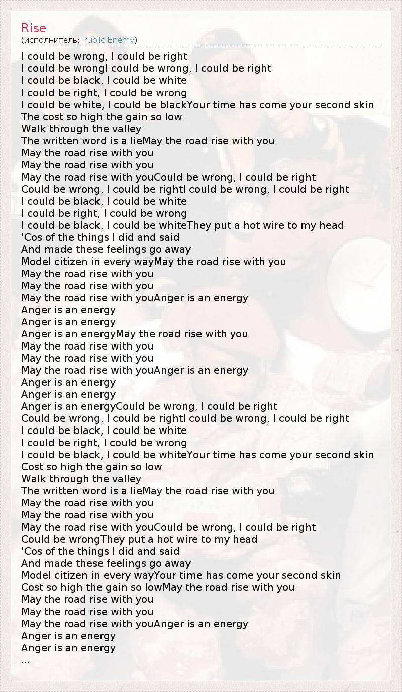 Это интересно:Группа Public Enemy относится к тем редким коллективам, о которых трудно едко шутить и желчно жечь. Осилившие интро узнают сокровенное.За всю их долгую историю всегда все было серьезно, даже несмотря на принудительную клоунаду одного из их участников. Эта визуальная экспрессия была скорее лимоном в кофе, чем гелием в легкие. Когда рэп миновал стадию party-рэпа и уличную сублимацию длины детородного... продолжение