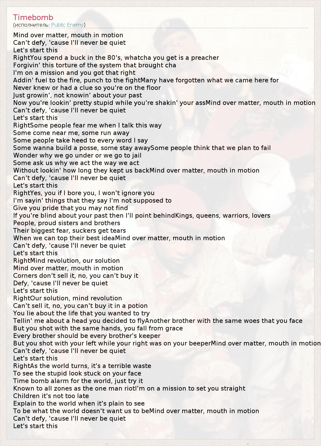 Mind over matter, mouth in motion Can't defy, 'cause I'll never be quiet Let's start this RightYou spend a buck in the 80's, whatcha you get is a preacher Forgivin' this torture of the system that brought cha I'm on a mission and you got that right Addin' fuel to the fire, punch to the fightMany have forgotten what we came here for Never knew or had a clue so you're on the floor Just growin', not knowin' about your past Now you're lookin' pretty stupid while you're shakin' your assMind over matter, mouth in motion Can't defy, 'cause I'll never be quiet Let's start this RightSome people fear me when I talk this way Some come near me, some run away Some people take heed to every word I say Some wanna build a posse, some stay awaySome people think that we plan to fail Wonder why we go under or we go to jail Some ask us why we act the way we act Without lookin' how long they kept us backMind over matter, mouth in motion Can't defy, 'cause I'll never be quiet Let's start this RightYes, you if I bore you, I won't ignore you I'm sayin' things that they say I'm not supposed to Give you pride that you may not find If you're blind about your past then I'll point behindKings, queens, warriors, lovers People, proud sisters and brothers Their biggest fear, suckers get tears When we can top their best ideaMind over matter, mouth in motion Can't defy, 'cause I'll never be quiet Let's start this RightMind revolution, our solution Mind over matter, mouth in motion Corners don't sell it, no, you can't buy it Defy, 'cause I'll never be quiet Let's start this RightOur solution, mind revolution Can't sell it, no, you can't buy it in a potion You lie about the life that you wanted to try Tellin' me about a head you decided to flyAnother brother with the same woes that you face But you shot with the same hands, you fall from grace Every brother should be every brother's keeper But you shot with your left while your right was on your beeperMind over matter, mouth in motion Can't defy, 'cause I'll never be quiet Let's start this RightAs the world turns, it's a terrible waste To see the stupid look stuck on your face Time bomb alarm for the world, just try it Known to all zones as the one man riotI'm on a mission to set you straight Children it's not too late Explain to the world when it's plain to see To be what the world doesn't want us to beMind over matter, mouth in motion Can't defy, 'cause I'll never be quiet Let's start this
