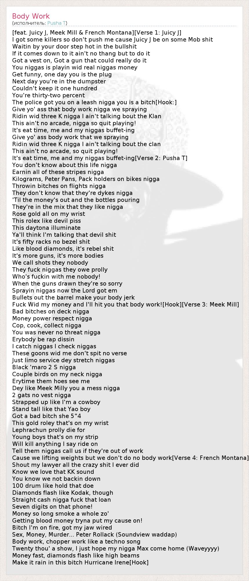 [feat. Juicy J, Meek Mill & French Montana][Verse 1: Juicy J] I got some killers so don't push me cause Juicy J be on some Mob shit Waitin by your door step hot in the bullshit If it comes down to it ain't no thang but to do it Got a vest on, Got a gun that could really do it You niggas is playin wid real niggas money Get funny, one day you is the plug Next day you're in the dumpster Couldn't keep it one hundred You're thirty-two percent The police got you on a leash nigga you is a bitch[Hook:] Give yo' ass that body work nigga we spraying Ridin wid three K nigga I ain't talking bout the Klan This ain't no arcade, nigga so quit playing! It's eat time, me and my niggas buffet-ing Give yo' ass body work that we spraying Ridin wid three K nigga I ain't talking bout the clan This ain't no arcade, so quit playing! It's eat time, me and my niggas buffet-ing[Verse 2: Pusha T] You don't know about this life nigga Earnin all of these stripes nigga Kilograms, Peter Pans, Pack holders on bikes nigga Throwin bitches on flights nigga They don't know that they're dykes nigga 'Til the money's out and the bottles pouring They're in the mix that they like nigga Rose gold all on my wrist This rolex like devil piss This daytona illuminate Ya'll think I'm talking that devil shit It's fifty racks no bezel shit Like blood diamonds, it's rebel shit It's more guns, it's more bodies We call shots they nobody They fuck niggas they owe prolly Who's fuckin with me nobody! When the guns drawn they're so sorry Sprayin niggas now the Lord got em Bullets out the barrel make your body jerk Fuck Wid my money and I'll hit you that body work![Hook][Verse 3: Meek Mill] Bad bitches on deck nigga Money power respect nigga Cop, cook, collect nigga You was never no threat nigga Erybody be rap dissin I catch niggas I check niggas These goons wid me don't spit no verse Just limo service dey stretch niggas Black 'maro 2 S nigga Couple birds on my neck nigga Erytime them hoes see me Dey like Meek Milly you a mess nigga 2 gats no vest nigga Strapped up like I'm a cowboy Stand tall like that Yao boy Got a bad bitch she 5"4 This gold roley that's on my wrist Lephrachun prolly die for Young boys that's on my strip Will kill anything I say ride on Tell them niggas call us if they're out of work Cause we lifting weights but we don't do no body work[Verse 4: French Montana] Shout my lawyer all the crazy shit I ever did Know we love that KK sound You know we not backin down 100 drum like hold that doe Diamonds flash like Kodak, though Straight cash nigga fuck that loan Seven digits on that phone! Money so long smoke a whole zo' Getting blood money tryna put my cause on! Bitch I'm on fire, got my jaw wired Sex, Money, Murder... Peter Rollack (Soundview waddap) Body work, chopper work like a techno song Twenty thou' a show, I just hope my nigga Max come home (Waveyyyy) Money fast, diamonds flash like high beams Make it rain in this bitch Hurricane Irene[Hook]