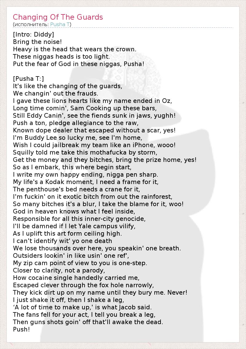 [Вступление: Diddy] Поднимите шум! Нет покоя голове в венце. У этих черномазых в бошках маловато мозгов. Всели в этих ниггеров страх пред Богом, Пуша! [Pusha T:] Это как смена караула: Мы заменяем притворщиков. Я дал этим львам смелость, как Волшебник Изумрудного города, Грядёт долгая эпоха, я слагаю строки, как Сэм Кук, 1 До сих пор, как Эдди Кейн, вижу нычки во рту у нарков, йахх! 2 Толкаю тонну, присягаю на верность неразбавленному, Знаменитый наркодилер, избежавший шрамов, да! Я Бадди Ли, мне повезло: я дома. 3 Хотел бы я взломать стены тюрем, как айфон, ву-у! Сквилли сказал мне, что их нужно брать штурмом, Забрать деньги и тёлок, привезти трофей домой, да! Начало было положено, когда я сел на корабль, Я сам написал для себя счастливый конец, я остр, как перо. Моя жизнь стоит фотоснимка, мне нужна рамка для него, Чтобы поднять кровать в пентхаус понадобится кран, Я сношаю на ней экзотичных тёлок из дождевых лесов, Столько баб, что я их не запоминаю, но беру на себя вину, ву-у! Бог в раю знает, что у меня в душе, Я ответственен за внутригородской геноцид, Будь я проклят, если позволю Йелю поносить меня, Пока поднимаю это искусство на должную высоту. 4 Я не могу отождествлять себя с одной вашей смертью, Вы говорите об одном человеке, а мы здесь потеряли тысячи. Аутсайдеры косо смотрят на меня из-за одной ремарки, Моё тончайшее зрение для вас не стоит выеденного яйца. Близок к просветлению, и это не пародия, Кокаин в одиночку вытащил меня, Я с умом сбежал через лисью нору, Моё имя поливают грязью, пока не погребут совсем. Да никогда! Я просто отряхнусь и двину дальше, "Осталось ещё много часов", — сказал мне ювелир. Фанаты купились на твоё актёрство, а я сломаю тебе ногу, А потом прогремят выстрелы, которые разбудят и мёртвого. Пуш! 1 — Сэм Кук – американский вокалист, стоявший у истоков соул-музыки. 2 — Эдди Кинг-младший — персонаж американского музыкального фильма 1991 года "The Five Heartbeats". 3 — Бадди Ли — талисман рекламной кампании джинсов "Lee". 4 — Pusha T упомянул убийство студентки Йельского Энни Ли в песне Young Jeezy "Illin'", за что подвергся резкой критике.