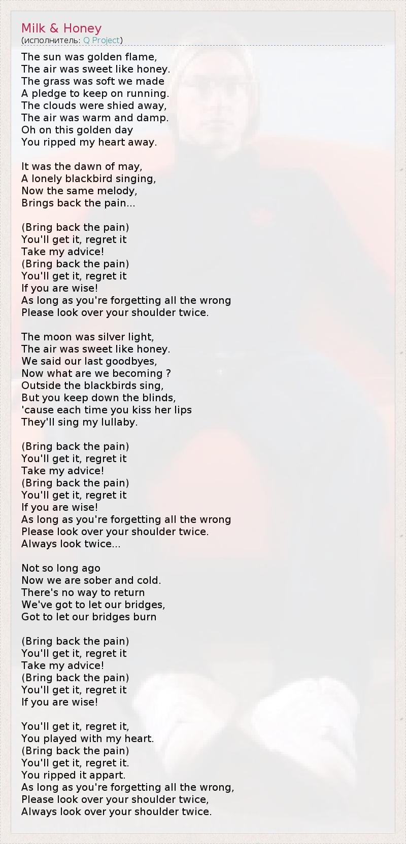 The sun was golden flame, The air was sweet like honey. The grass was soft we made A pledge to keep on running. The clouds were shied away, The air was warm and damp. Oh on this golden day You ripped my heart away. It was the dawn of may, A lonely blackbird singing, Now the same melody, Brings back the pain... (Bring back the pain) You'll get it, regret it Take my advice! (Bring back the pain) You'll get it, regret it If you are wise! As long as you're forgetting all the wrong Please look over your shoulder twice. The moon was silver light, The air was sweet like honey. We said our last goodbyes, Now what are we becoming ? Outside the blackbirds sing, But you keep down the blinds, 'cause each time you kiss her lips They'll sing my lullaby. (Bring back the pain) You'll get it, regret it Take my advice! (Bring back the pain) You'll get it, regret it If you are wise! As long as you're forgetting all the wrong Please look over your shoulder twice. Always look twice... Not so long ago Now we are sober and cold. There's no way to return We've got to let our bridges, Got to let our bridges burn (Bring back the pain) You'll get it, regret it Take my advice! (Bring back the pain) You'll get it, regret it If you are wise! You'll get it, regret it, You played with my heart. (Bring back the pain) You'll get it, regret it. You ripped it appart. As long as you're forgetting all the wrong, Please look over your shoulder twice, Always look over your shoulder twice.